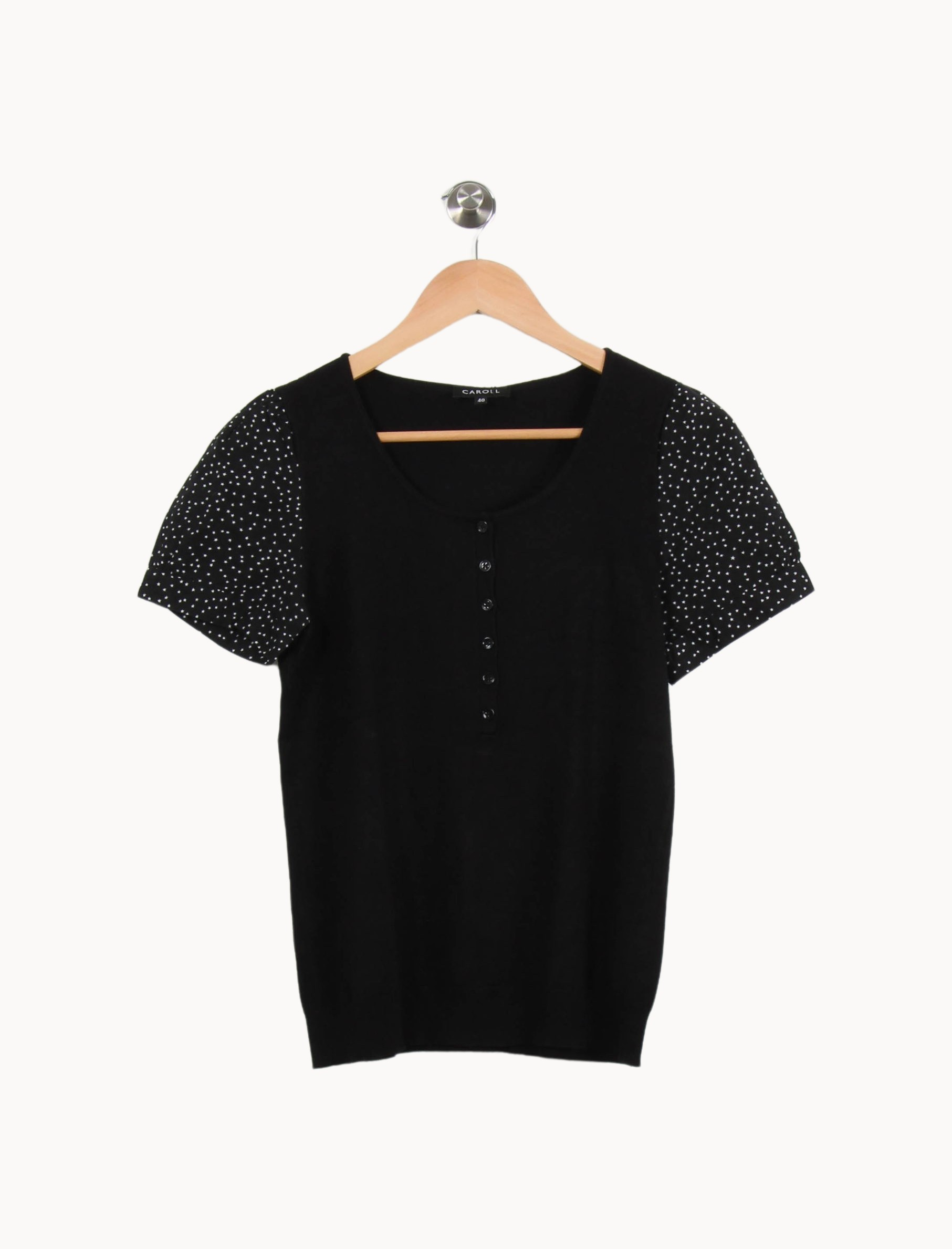 Découvrez l'élégance intemporelle avec ce tee-shirt noir signé Caroll, un essentiel de toute garde-robe. Confectionné dans une matière douce et fluide, la viscose, ce haut offre un confort exceptionnel tout en soulignant votre silhouette avec raffinement. Sa teinte noire profonde assure une facilité de style, se mariant parfaitement à toutes vos tenues, qu'elles soient décontractées ou plus habillées. La marque Caroll, reconnue pour son chic parisien, est ici synonyme de qualité et de durabilité. En adoptant ce tee-shirt, vous faites un choix mode responsable, optant pour une pièce de seconde main qui allie tendance et respect de l'environnement.