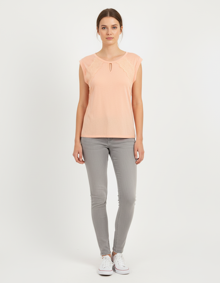 Top orange One Step, taille XS/34 : ce haut délicat signé One Step affiche une teinte orange douce, idéal pour les silhouettes fines. Confectionné dans une matière légère, ce top se distingue par ses empiècements en dentelle délicate sur les épaules et un détail goutte au col, conférant élégance et raffinement à la pièce. Parfait pour une sortie estivale ou une occasion décontractée chic, il s’associe facilement à un pantalon blanc ou une jupe pour un look frais et féminin.