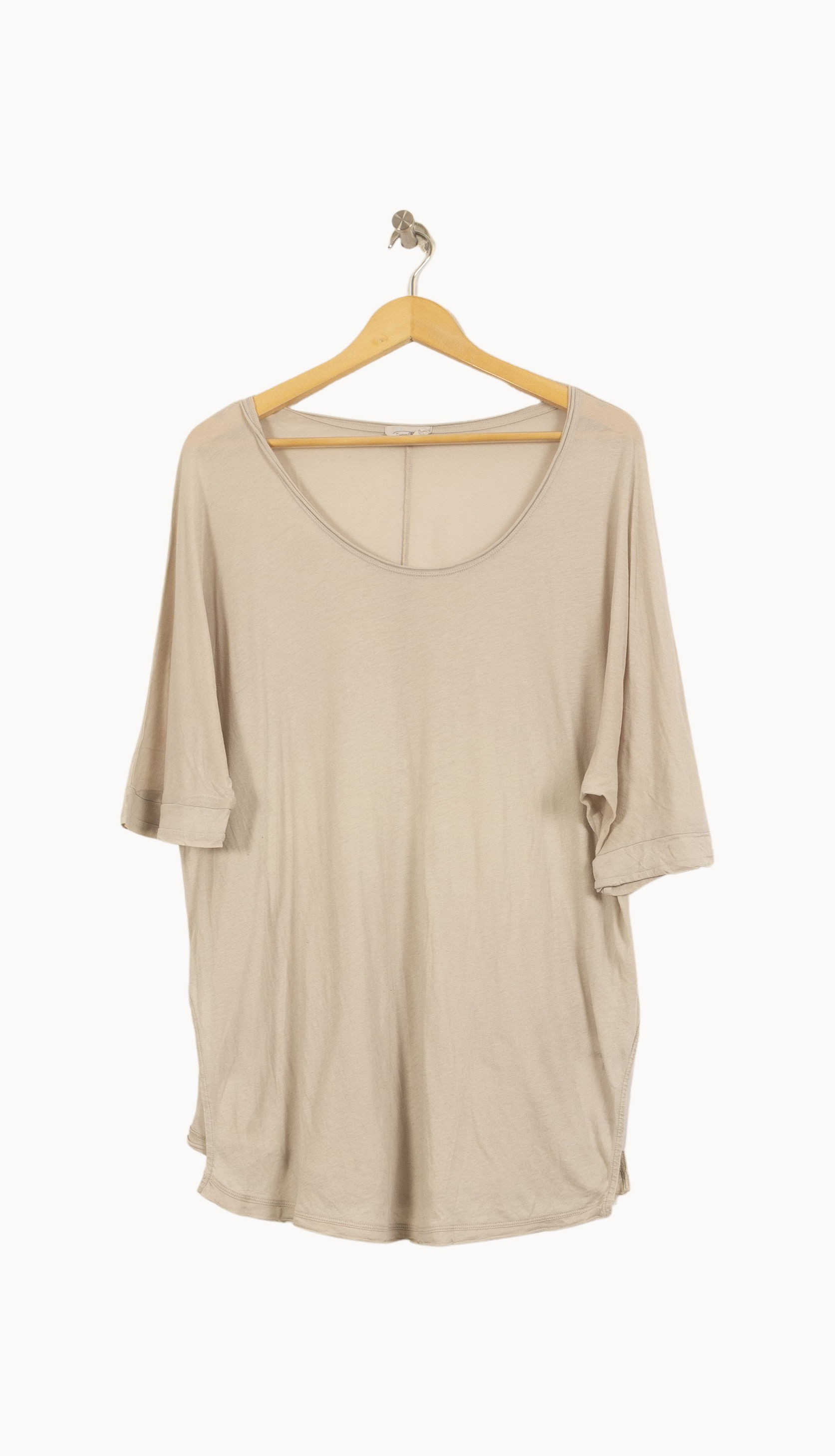 Top beige American Vintage, taille L/40 : un basique élégant et confortable signé American Vintage, parfait pour compléter toutes les gardes-robes. Confectionné dans une matière fluide et légère, ce top arbore une coupe ample et des manches mi-longues, offrant un tombé naturel et une grande liberté de mouvement. Idéal pour une journée décontractée ou pour composer un look casual chic lors d’un brunch entre amis.