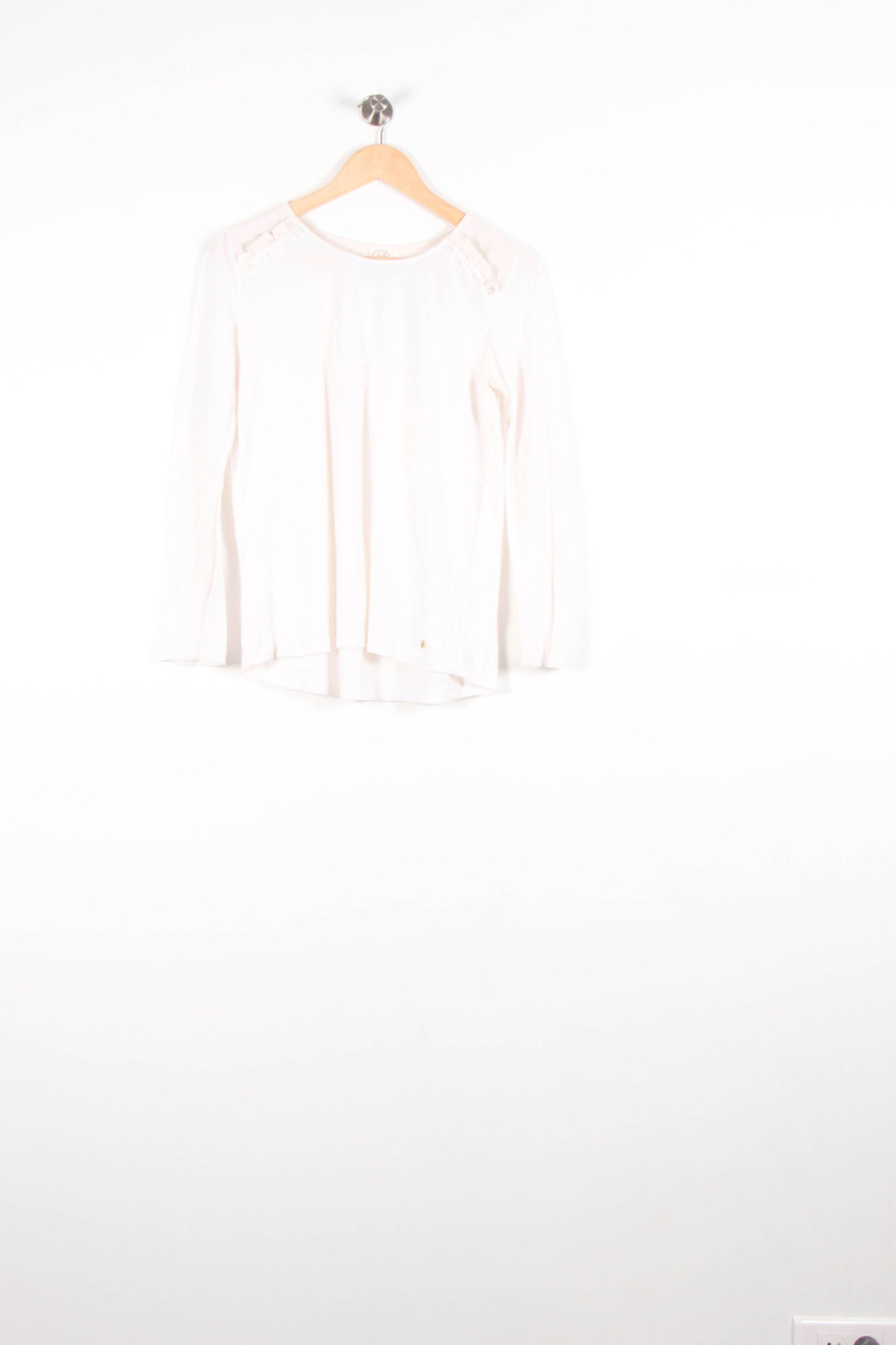 Top blanc à manches longues Des Petits Hauts, taille S/36, élégant et intemporel, parfait pour compléter une garde-robe raffinée. Confectionné dans une matière légère et douce, ce modèle se distingue par ses détails délicats au niveau des épaules, apportant une touche subtile d'originalité. Idéal pour une journée au bureau ou une sortie décontractée, il s'accorde facilement avec un pantalon ou une jupe pour une allure chic et moderne.