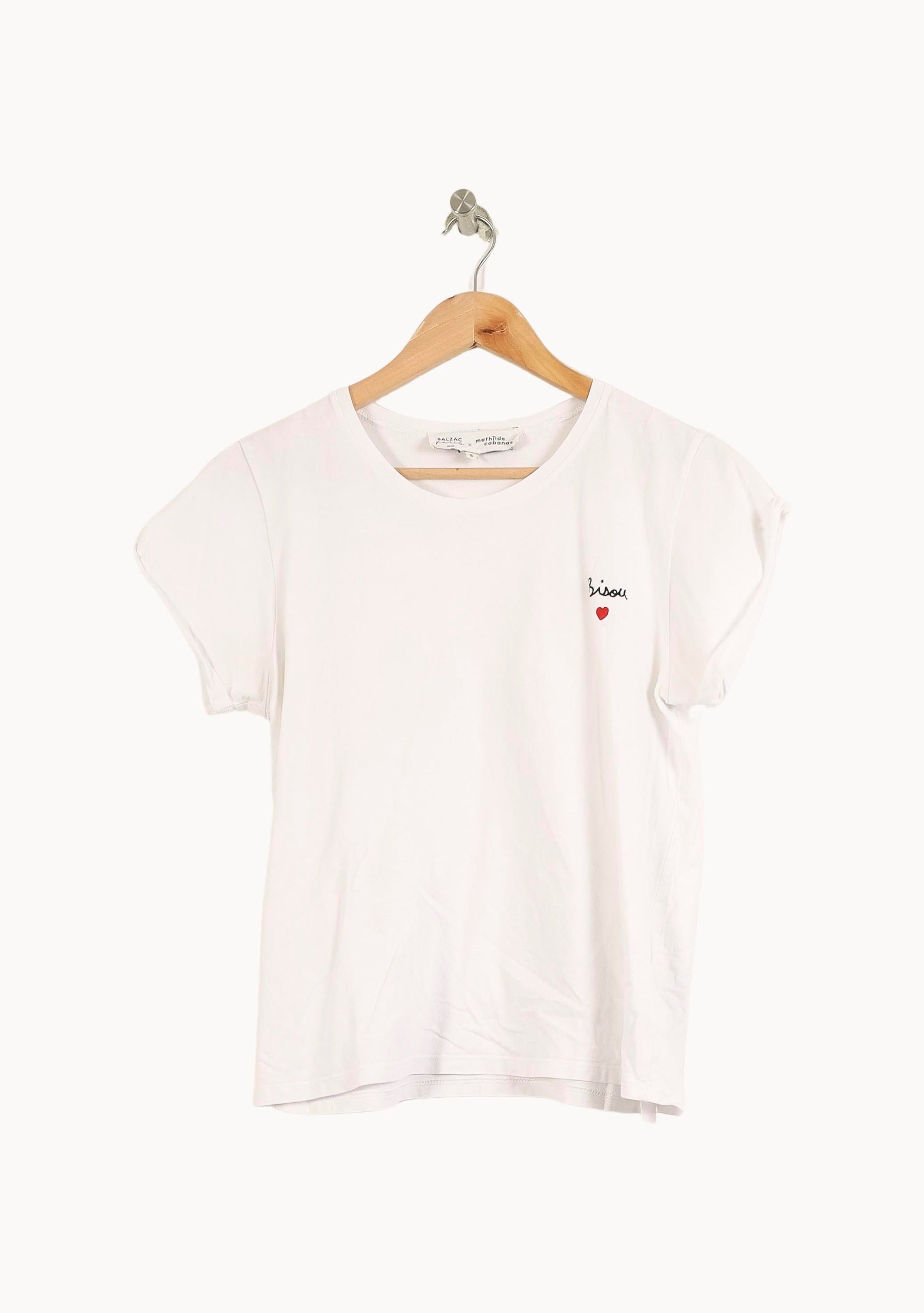 T-shirt blanc "Bisou" Balzac Paris, taille S/36, parfait pour un style épuré et féminin. Confectionné dans une matière douce et légère à l’aspect soigné, il se distingue par un petit motif brodé "bisou" accompagné d’un cœur rouge sur la poitrine, apportant une touche délicate et originale. Idéal pour une journée décontractée ou un week-end en ville associé à un jean.