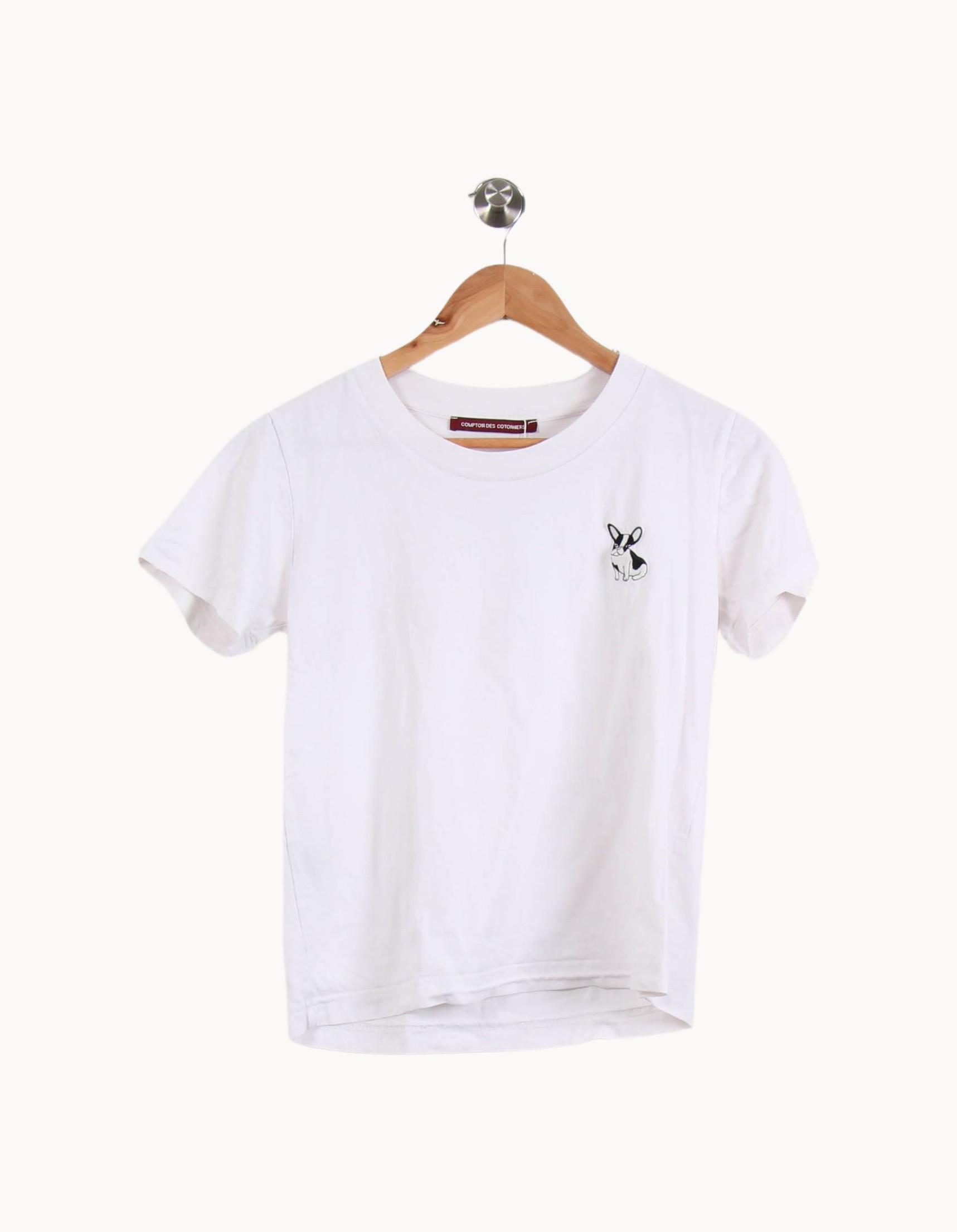 T-shirt blanc Comptoir des Cotonniers, taille XS/34, au design épuré doté d’une broderie élégante sur la poitrine. Confectionné dans une matière douce, ce top se distingue par sa coupe classique et le détail original du motif brodé, qui lui confère une touche subtile de caractère. Idéal pour une journée décontractée ou un brunch entre amis, il s’associe facilement à un jean ou une jupe pour un look casual et raffiné.