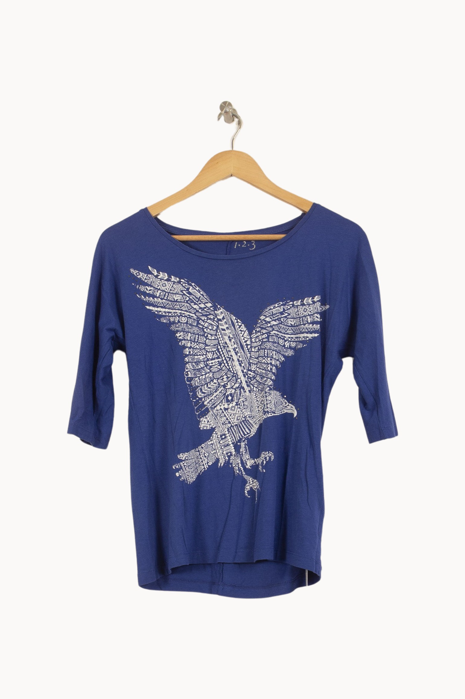 Top bleu Maison 123 taille S/36, orné d’un imprimé aigle graphique blanc sur le devant, pour une allure moderne et affirmée. Confectionné dans une matière fluide et douce au toucher, ce top se distingue par ses manches trois-quarts et son motif original détaillé qui apporte une touche d’originalité à la pièce. Parfait pour une tenue casual-chic lors d’un déjeuner en ville ou pour dynamiser votre look au quotidien.