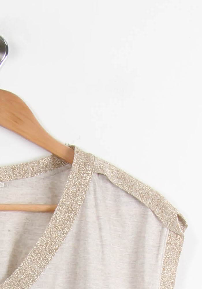 Top doré Maison 123, taille S/36 – Un modèle élégant à col V orné de liserés dorés, raffiné et tendance. Sa matière douce et légère est sublimée par des détails scintillants au niveau du col et des épaules, apportant une touche lumineuse et sophistiquée au vêtement. Ce top se porte idéalement lors d’un dîner entre amis ou pour une occasion qui nécessite une touche chic tout en restant confortable.