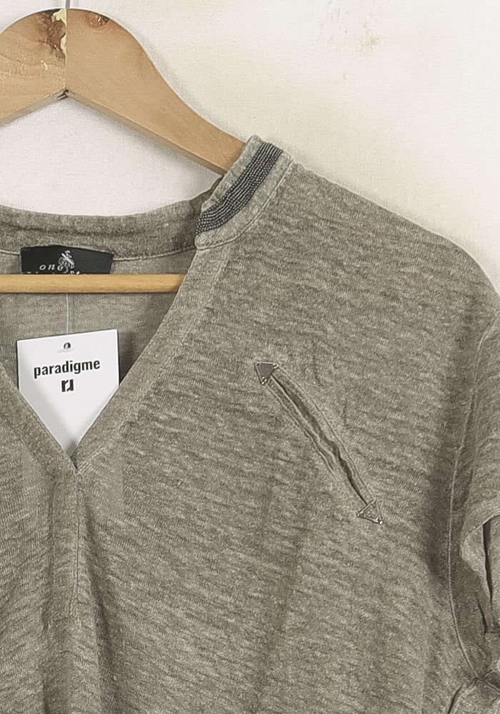 Top gris One Step, taille M/38 : ce t-shirt à manches courtes présente une coupe décontractée et un col en V moderne. Confectionné dans une matière fluide à effet chiné, il se distingue par ses détails de surpiqûres qui ajoutent une touche d’originalité discrète. Idéal pour une tenue casual chic au quotidien, lors d’une sortie en ville ou d’un rendez-vous entre amis.