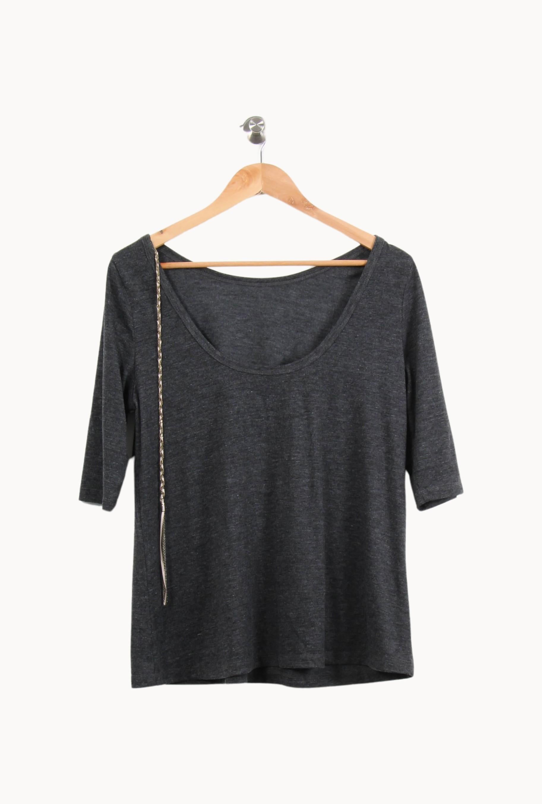 Top Suncoo gris en taille S/36, à manches mi-longues et encolure ronde, idéal pour un style décontracté et raffiné. Ce haut est confectionné dans une matière fluide et douce, offrant un tombé naturel et un confort optimal ; sa teinte gris foncé lui confère une élégance discrète et une grande polyvalence. Parfait pour une journée décontractée ou une sortie entre amis, porté avec un jean ou une jupe pour un look moderne et chic.