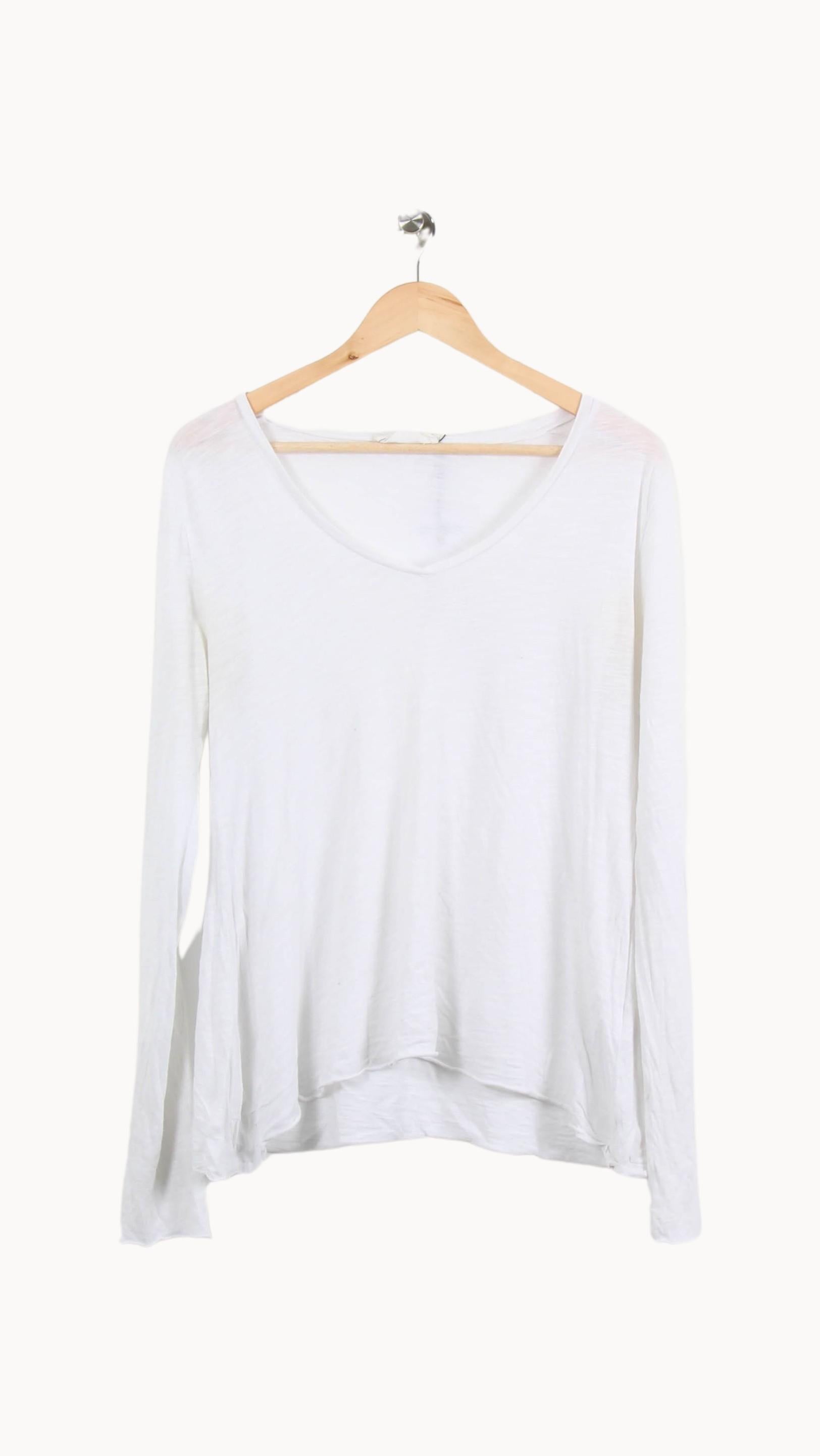 Top à manches longues blanc American Vintage, taille L/40, élégant et polyvalent. Confectionné dans une matière fluide et légère qui offre un tombé naturel, ce modèle se distingue par son col en V délicat et ses finitions épurées. Idéal pour une journée décontractée au bureau ou un brunch entre amis, apportant confort et style en toute simplicité.