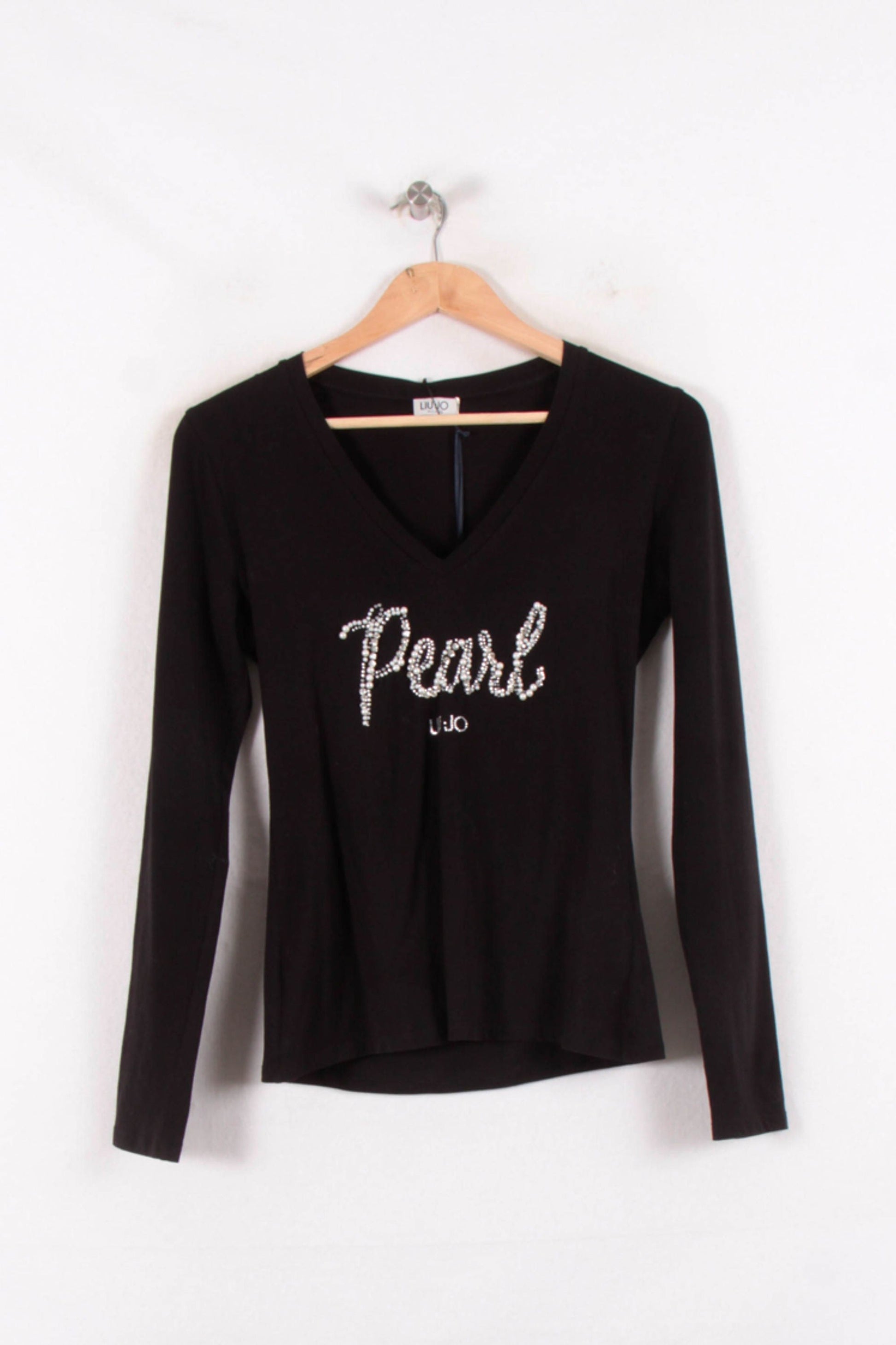 Top noir à manches longues "Pearl" Liu Jo, taille S/36, signé par la marque. Confectionné dans une matière douce et confortable, ce modèle se distingue par son décolleté en V ainsi que par son inscription "Pearl" ornée de strass scintillants, pour une allure élégante et raffinée. Parfait pour apporter une touche d’éclat à une tenue décontractée lors d’un dîner entre amis ou d’une sortie en ville.
