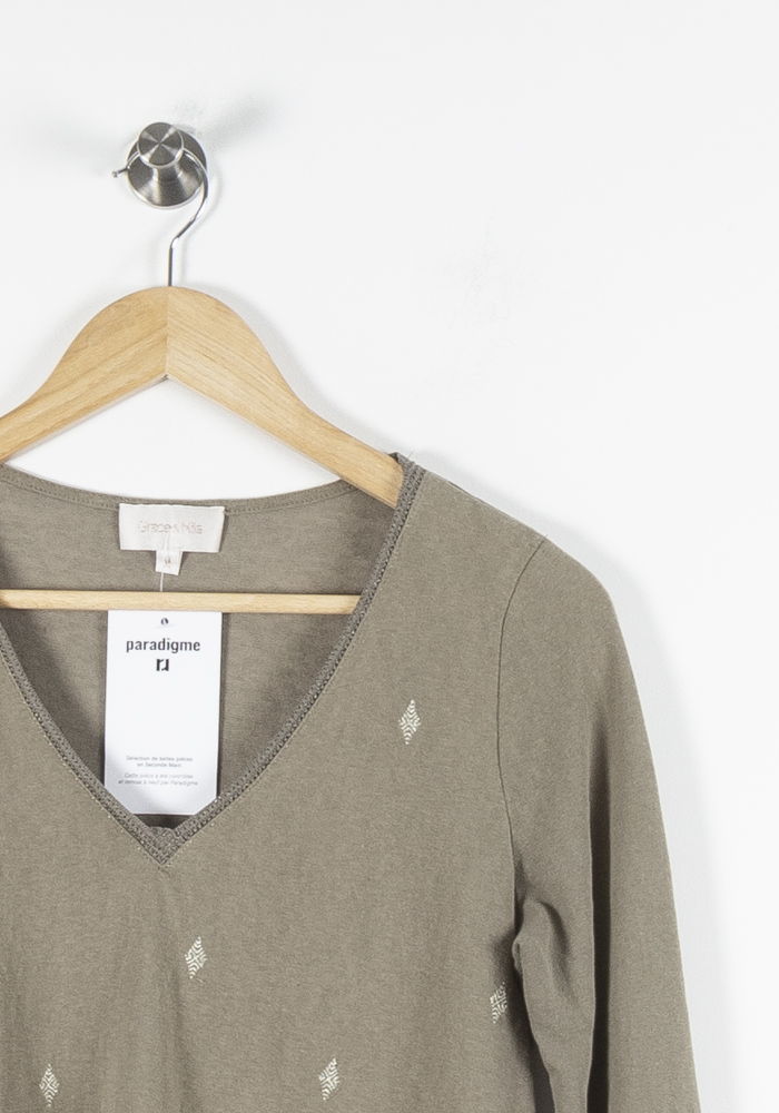 Top vert Grace & Mila, taille M/38, au design sobre et col en V, idéal pour un look décontracté chic. Composé de 80% coton et 20% polyester, ce vêtement se distingue par sa douceur et ses petits motifs brodés qui apportent une touche d’originalité à la pièce. Parfait pour une journée au bureau ou un déjeuner entre amis.
