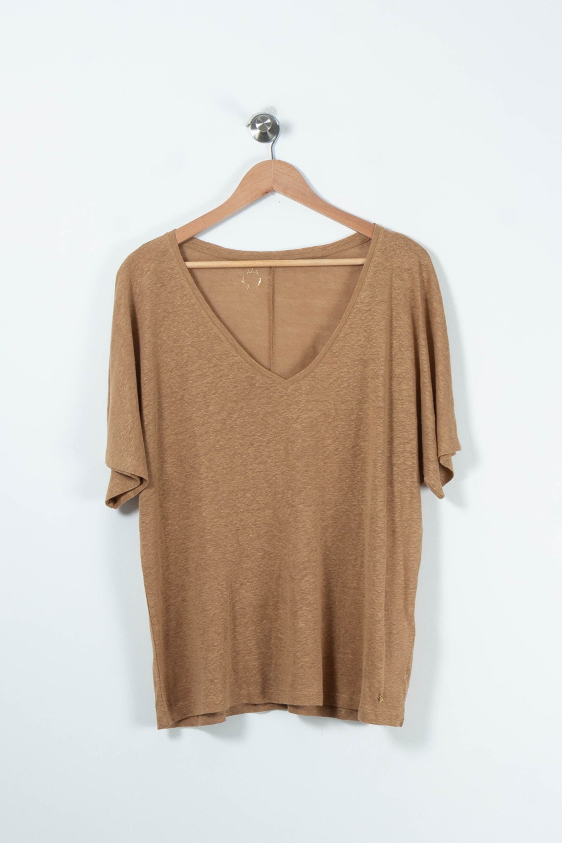 Top en lin marron Des Petits Hauts – taille XL/42 : un incontournable de la collection avec sa coupe fluide et son col V élégant. Confectionné en 100% lin, ce t-shirt séduit par sa légèreté, sa texture naturelle et son tombé souple qui lui confèrent un style raffiné et facile à porter. Idéal lors d’une sortie estivale ou pour une journée décontractée au bureau.