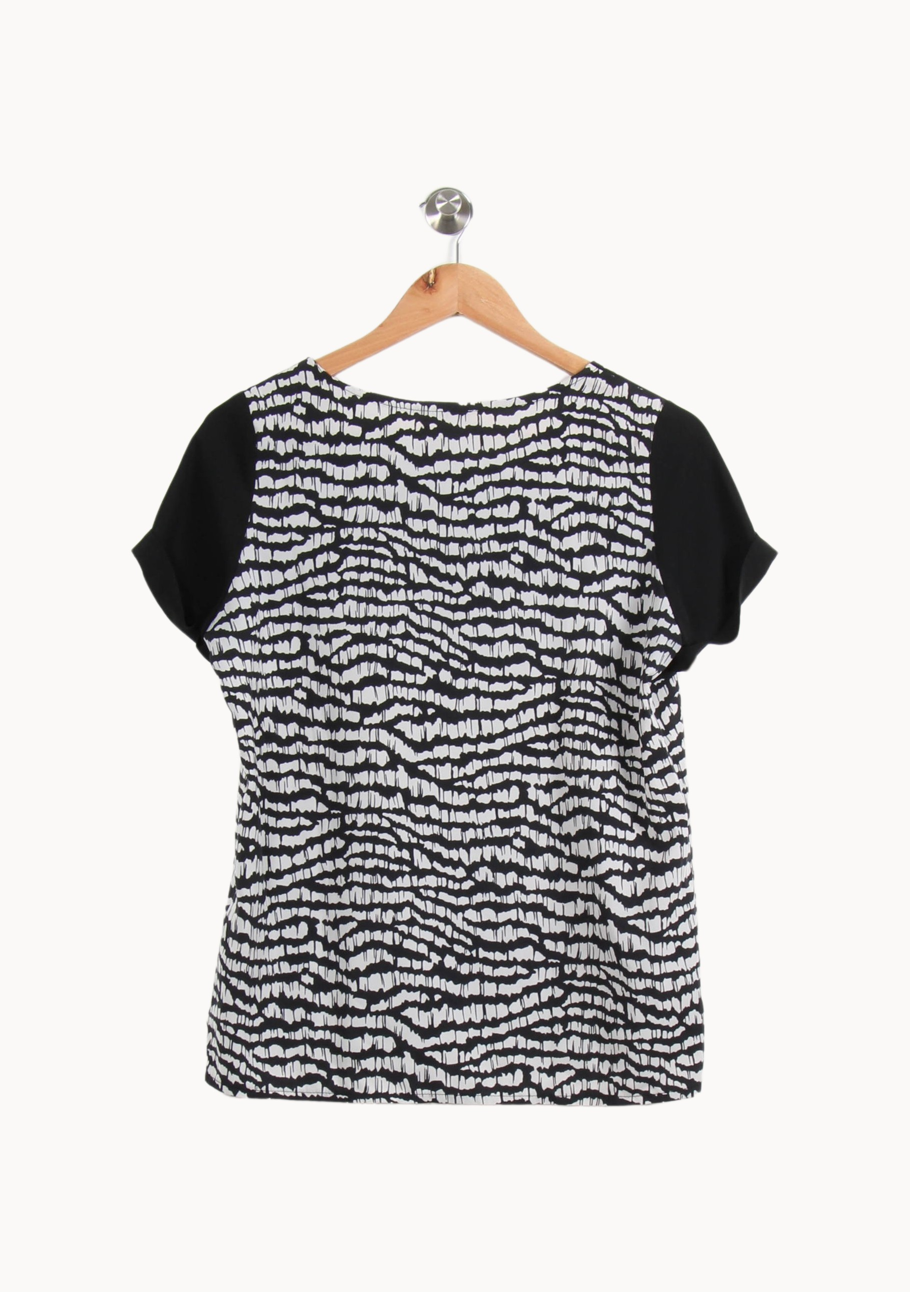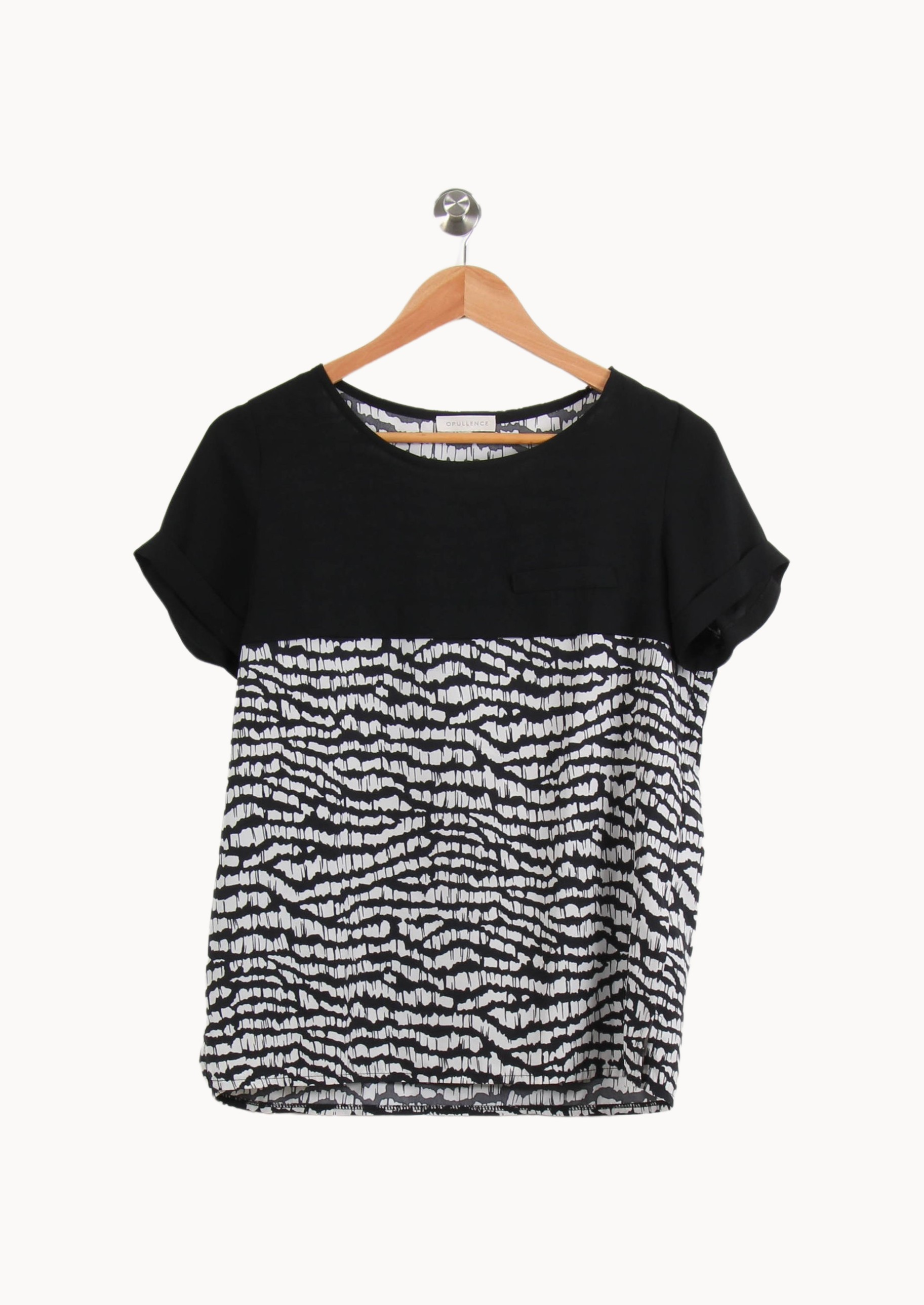 Top Opullence noir, taille T.U., alliant élégance et modernité grâce à son motif graphique contrasté sur la partie inférieure. Confectionné dans une matière légère et fluide, ce top se distingue par la sobriété de son haut uni et l’originalité de son imprimé zébré, offrant un jeu de textures raffiné pour un rendu unique. Idéal pour une journée de travail ou un rendez-vous décontracté, il apporte une touche chic et contemporaine à toutes vos tenues.