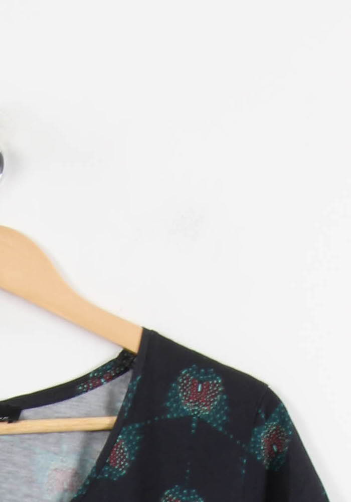 Top imprimé noir One Step, taille L/40, élégant et confortable, parfait pour habiller votre quotidien. Confectionné dans une matière légère, ce haut se distingue par ses motifs géométriques colorés, ainsi que ses manches courtes et son col en V, qui offrent une touche moderne et raffinée. Idéal pour une journée de travail ou une sortie décontractée entre amis.