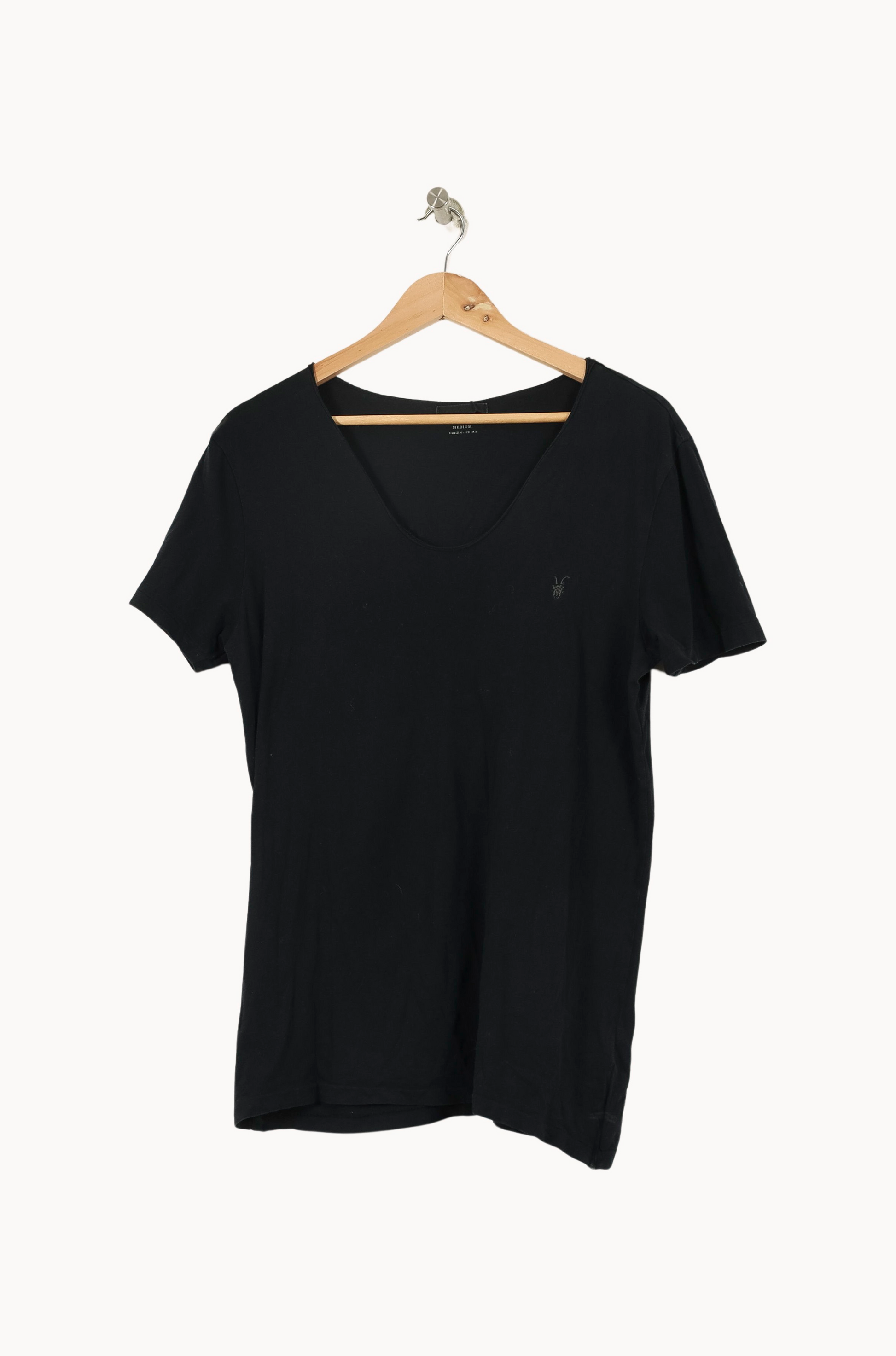 T-shirt All Saints noir, taille M/38, coupe classique à col en V, marque brodée sur la poitrine pour une signature discrète et élégante. Confectionné dans une matière douce et confortable, ce top se distingue par sa sobriété raffinée et la finesse de ses finitions, avec un détail brodé ton sur ton apportant une touche d’originalité. Idéal pour composer une tenue casual chic lors d’un déjeuner entre amis ou pour une sortie urbaine élégante.