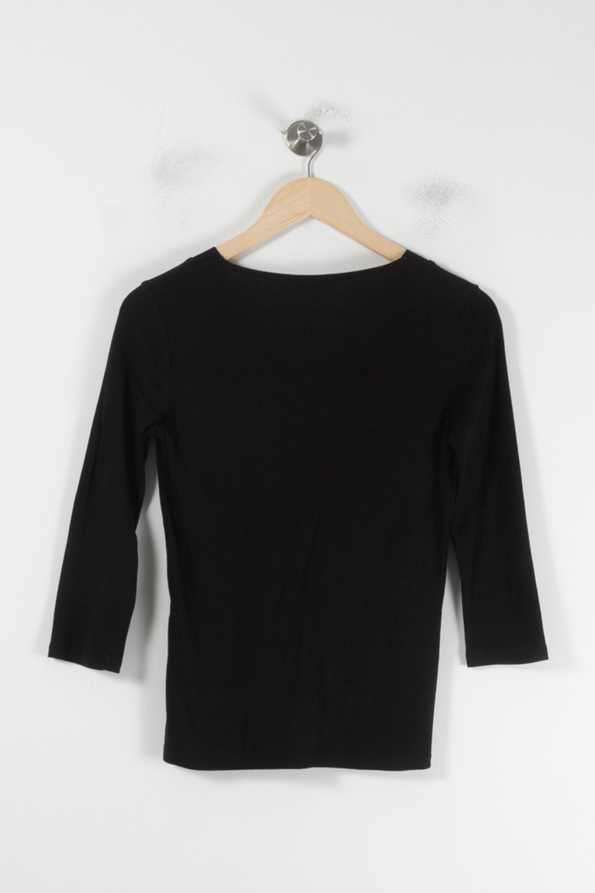 Top noir Maison 123, taille S/36, à manches trois-quarts avec col en V orné d'œillets métalliques. Confectionné en 100% viscose et modal, ce modèle se distingue par sa douceur et la modernité de son col ajouré qui apporte une touche d’originalité tout en restant élégant. Idéal pour une réunion professionnelle ou une sortie en ville, ce top s'adapte aisément à toutes vos envies.