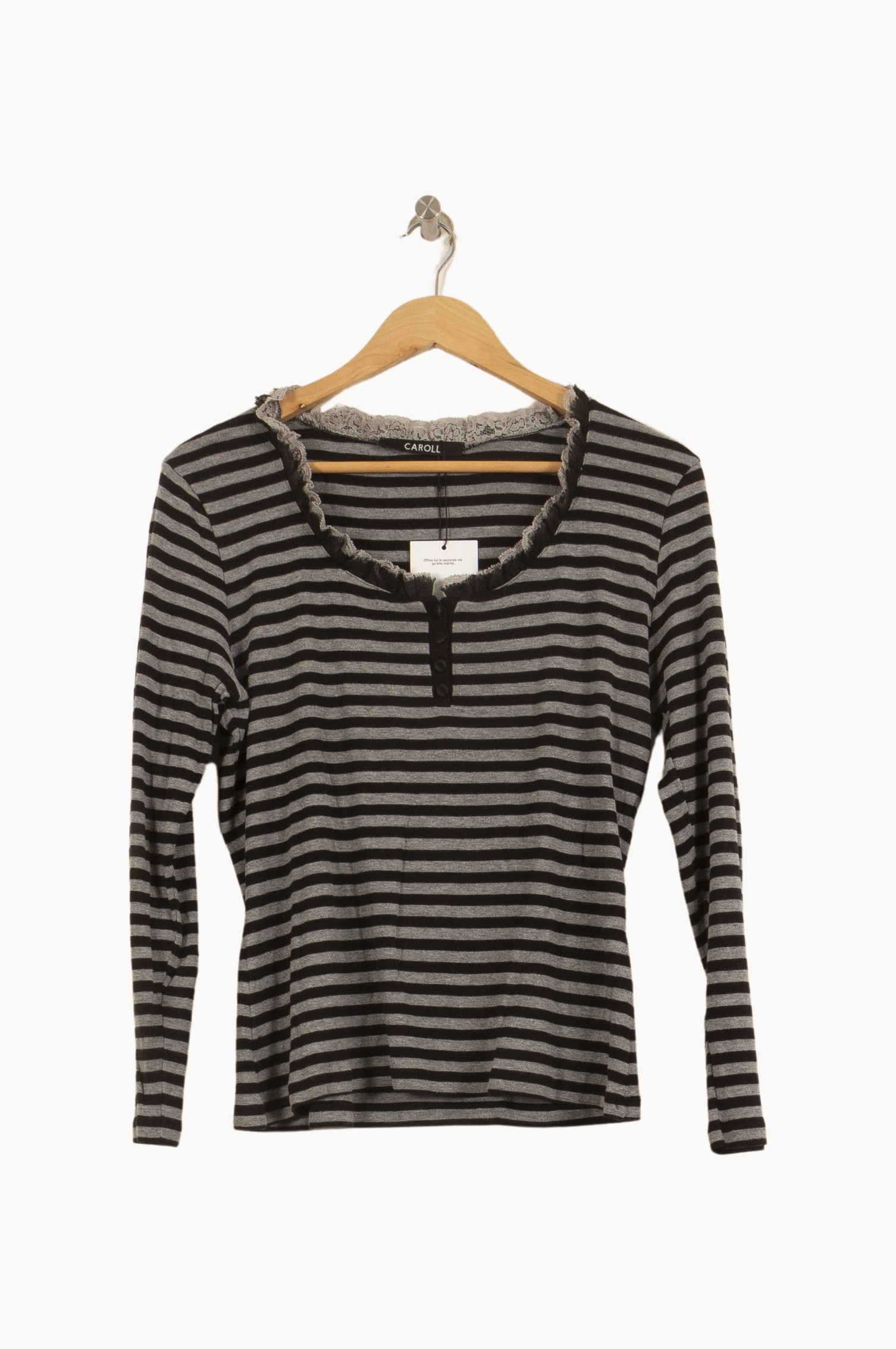 Top à rayures multicolores Caroll, taille XXXL/46, à manches longues et col rond orné de petits boutons. Confectionné dans une matière douce, ce haut se distingue par ses fines rayures horizontales contrastées et le détail délicat de son col à volants, apportant une touche de féminité subtile et raffinée. Idéal pour une journée décontractée ou un rendez-vous convivial entre amis.