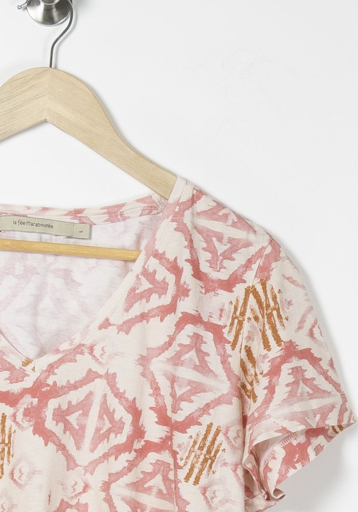 Top imprimé rose La Fée Maraboutée, taille L/40, idéal pour apporter une touche de fraîcheur à votre garde-robe. Confectionné en 100% coton, ce modèle séduit par sa douceur et son imprimé géométrique aux tons roses et orangés, qui lui confèrent une allure unique et moderne. Parfait pour une journée décontractée en ville ou un déjeuner printanier entre amis.