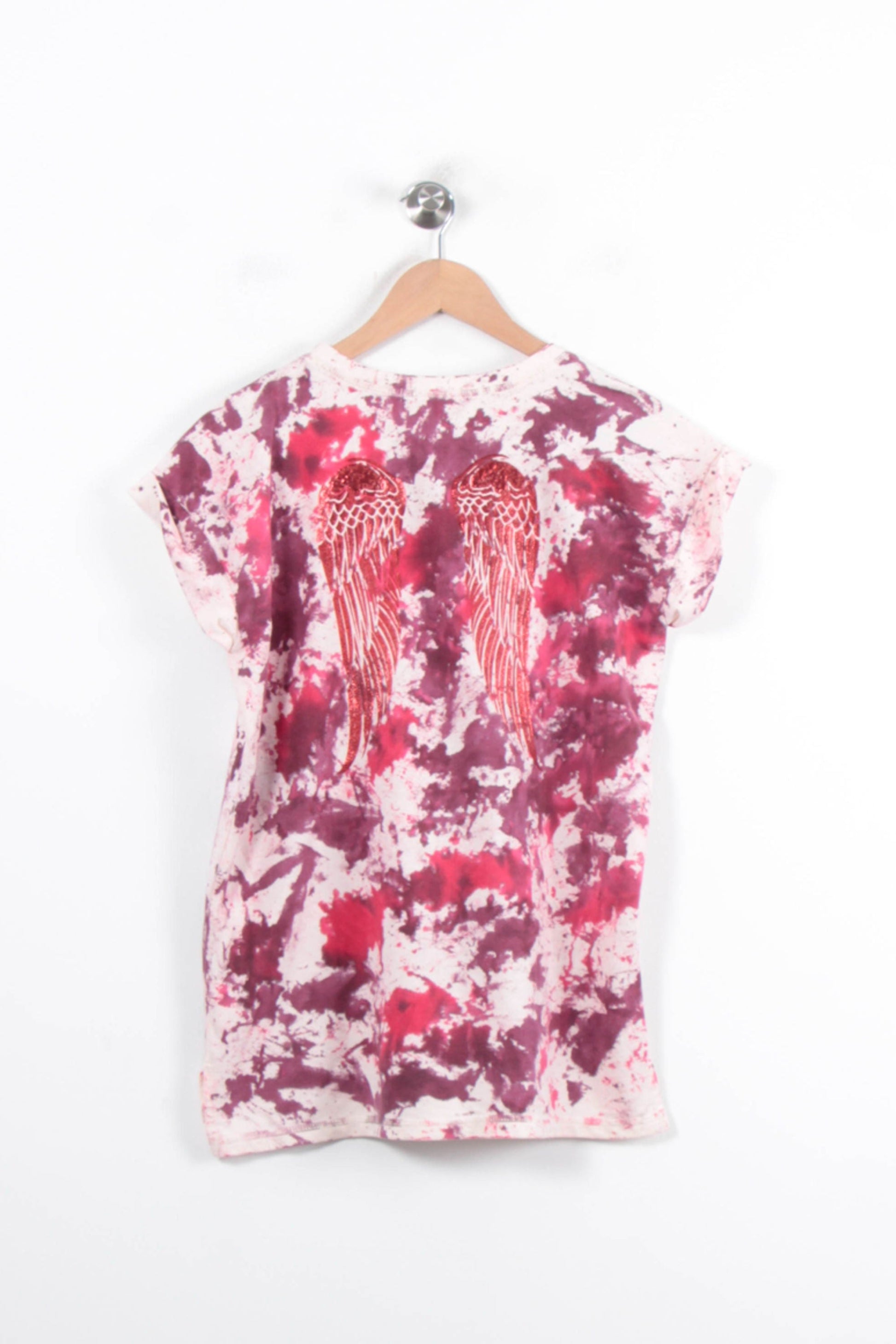 Top multicolore Bérénice taille M/38, à l'imprimé tie and dye dans les tons rose et violet, alliant modernité et originalité à votre dressing. La matière semble fluide et légère, et les manches légèrement retroussées apportent une touche décontractée qui distingue ce modèle, tandis que l'imprimé unique met en valeur chaque tenue. Parfait pour un look casual lors d’une journée estivale ou pour dynamiser un ensemble simple lors d’une sortie entre amis.