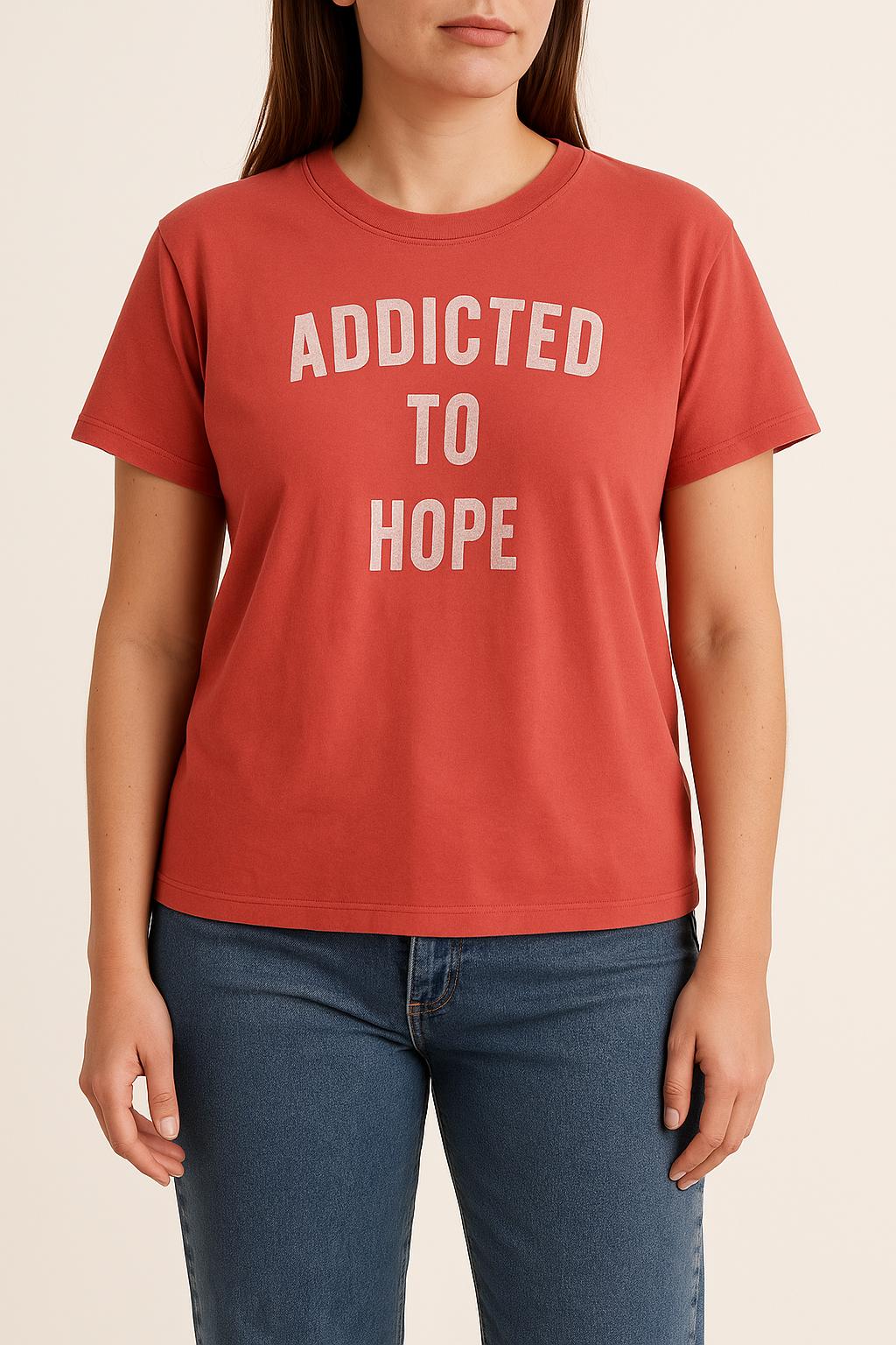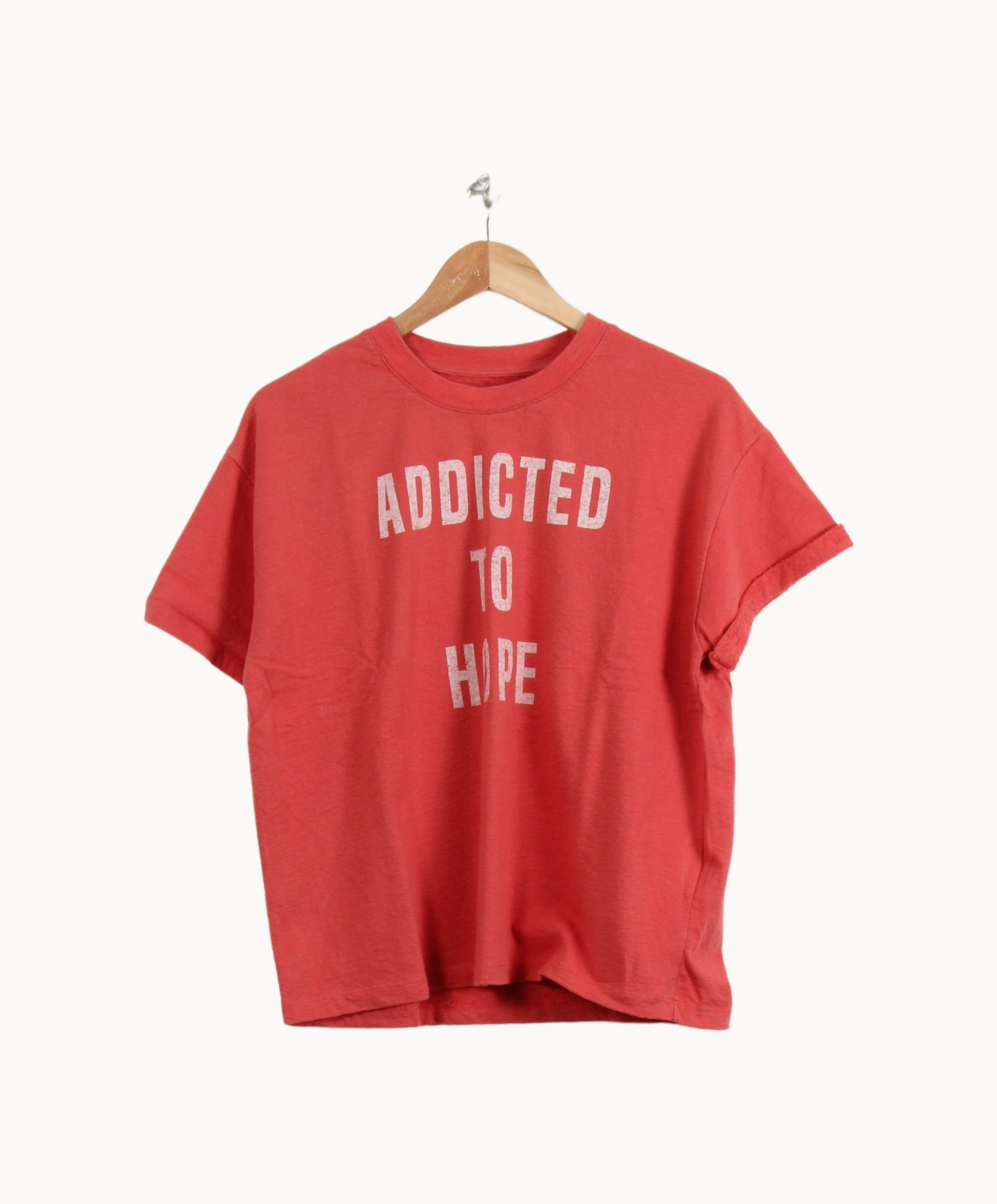 T-shirt ba&sh "Addicted to Hope" en taille L/40, de couleur rose, arborant une inscription blanche sur le devant. Confectionné dans une matière douce et fluide, ce top présente une coupe droite et des manches courtes, agrémenté d’un message imprimé qui apporte une touche moderne et distinctive. Idéal pour une tenue décontractée lors d’un week-end entre amis ou pour dynamiser un look casual au quotidien.