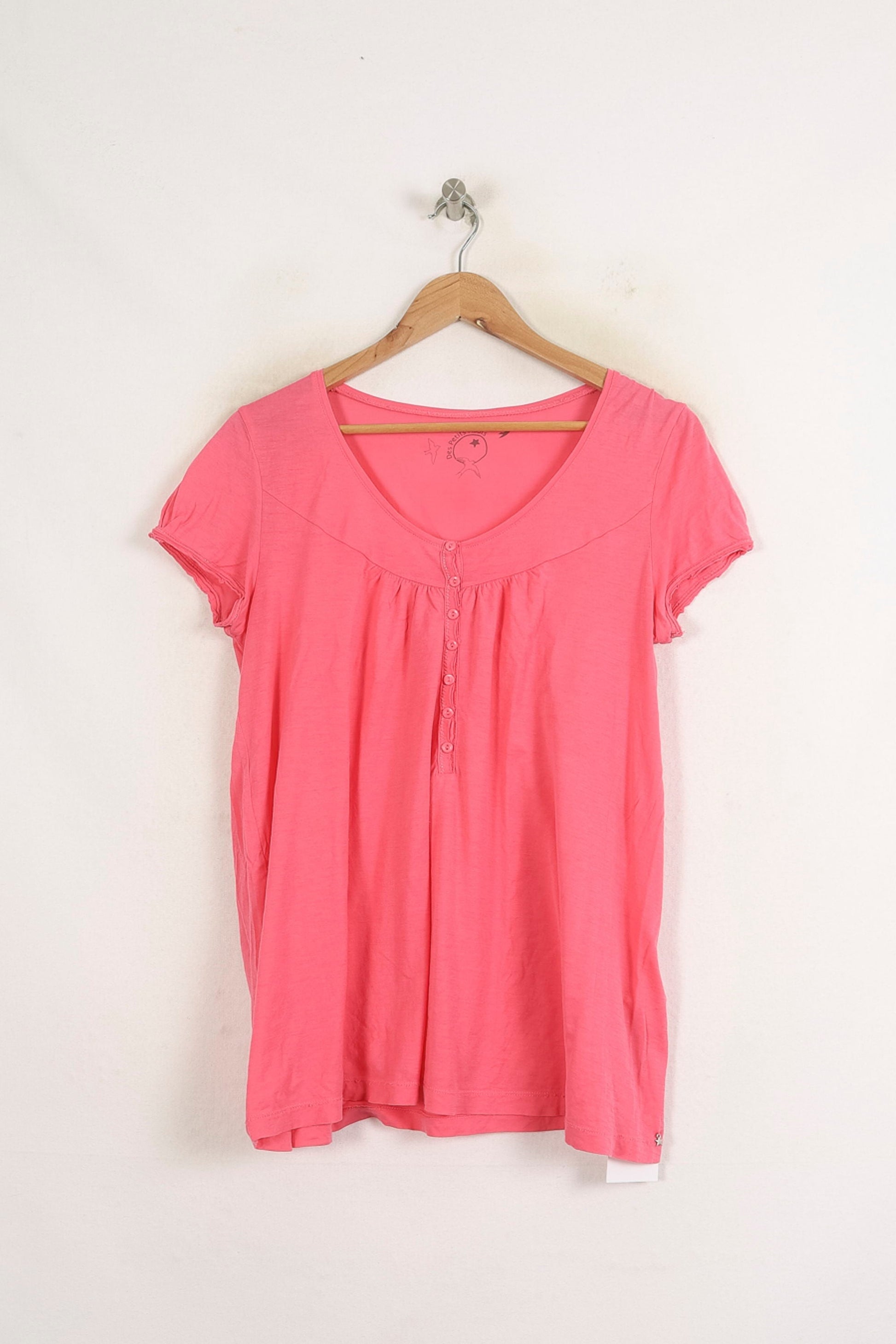 Top rose Des Petits Hauts taille L/40, à manches courtes et encolure ronde avec patte de boutonnage discrète à l’avant. Confectionné dans une matière souple et légère, il est agrémenté de fronces sous l’encolure qui lui apportent élégance et originalité. Parfait pour une journée décontractée ou un rendez-vous entre amis.