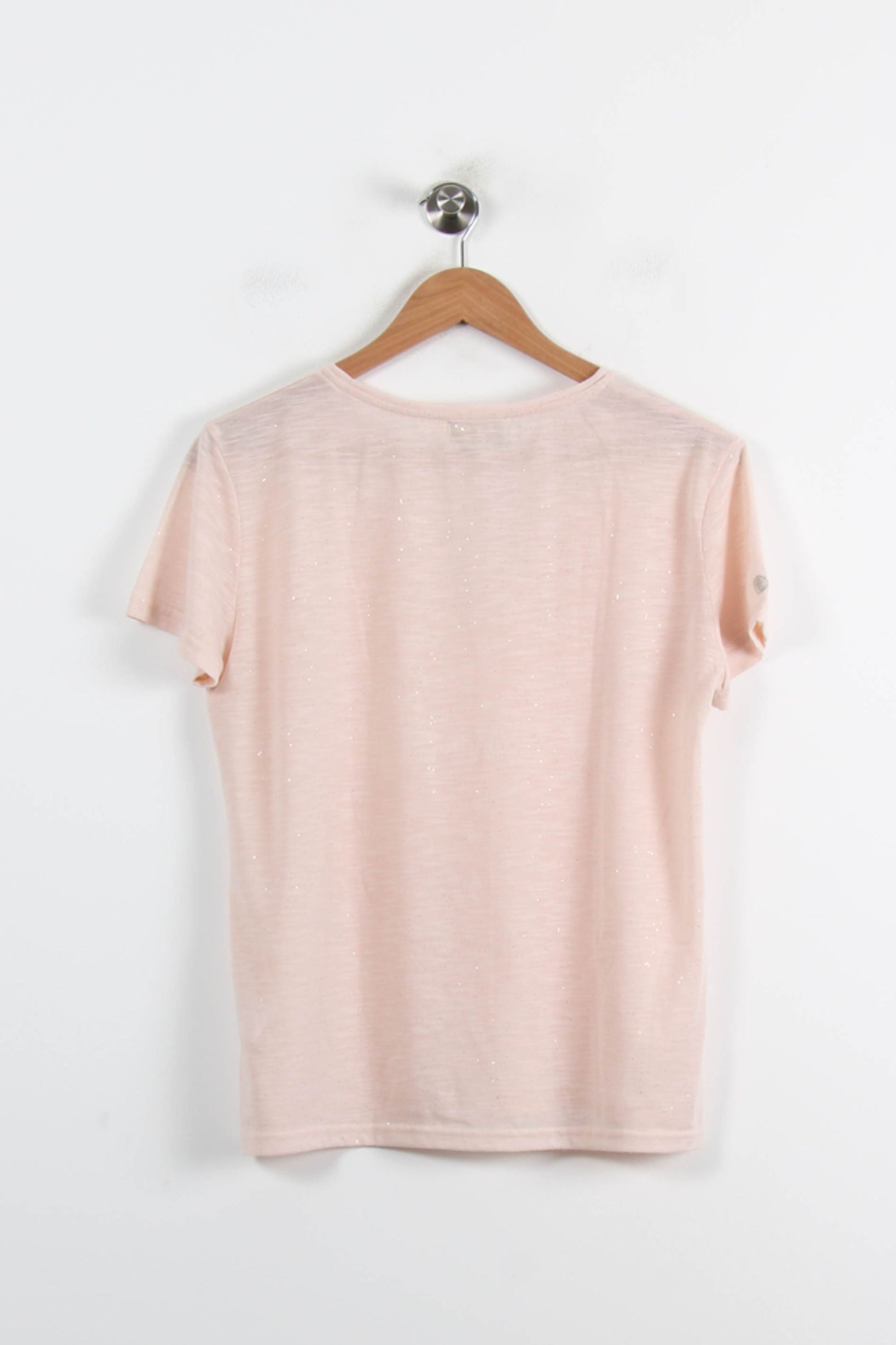 Top rose La Petite Etoile, taille L/40, à la coupe droite et manches courtes, alliant simplicité et féminité. Confectionné dans une matière légère, ce top se distingue par sa teinte pastel lumineuse et ses subtils détails brillants qui apportent une touche délicate et raffinée. Parfait pour une journée décontractée ou un après-midi entre amis, il accompagnera élégamment un jeans ou une jupe pour un look frais et soigné.
