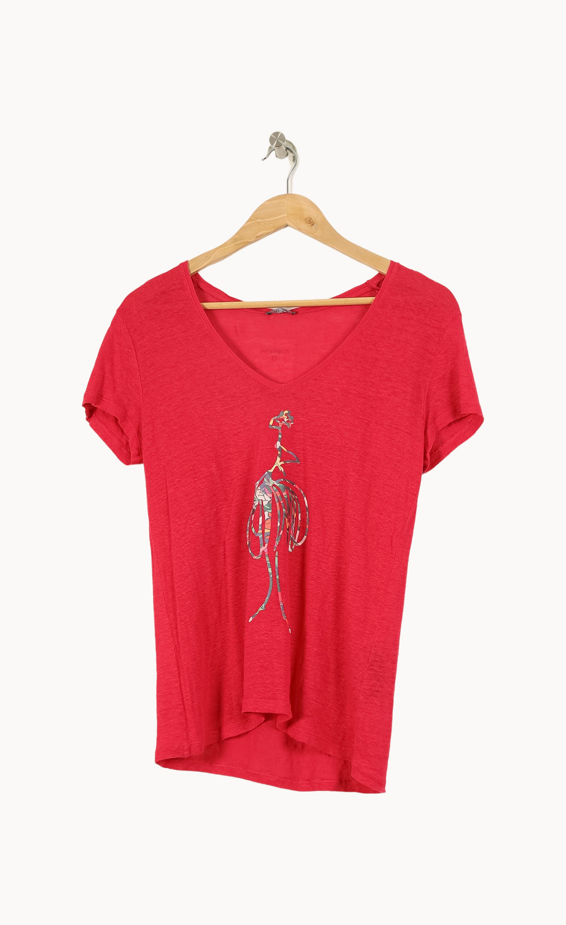 Top rose One Step, taille M/38, arborant un col en V et une élégante illustration centrale stylisée. Confectionné dans une matière fluide et légère, ce haut se distingue par sa coupe confortable et son motif artistique unique, apportant une touche d’originalité à l’ensemble. Idéal pour une sortie décontractée entre amis ou pour dynamiser une tenue de bureau estivale.