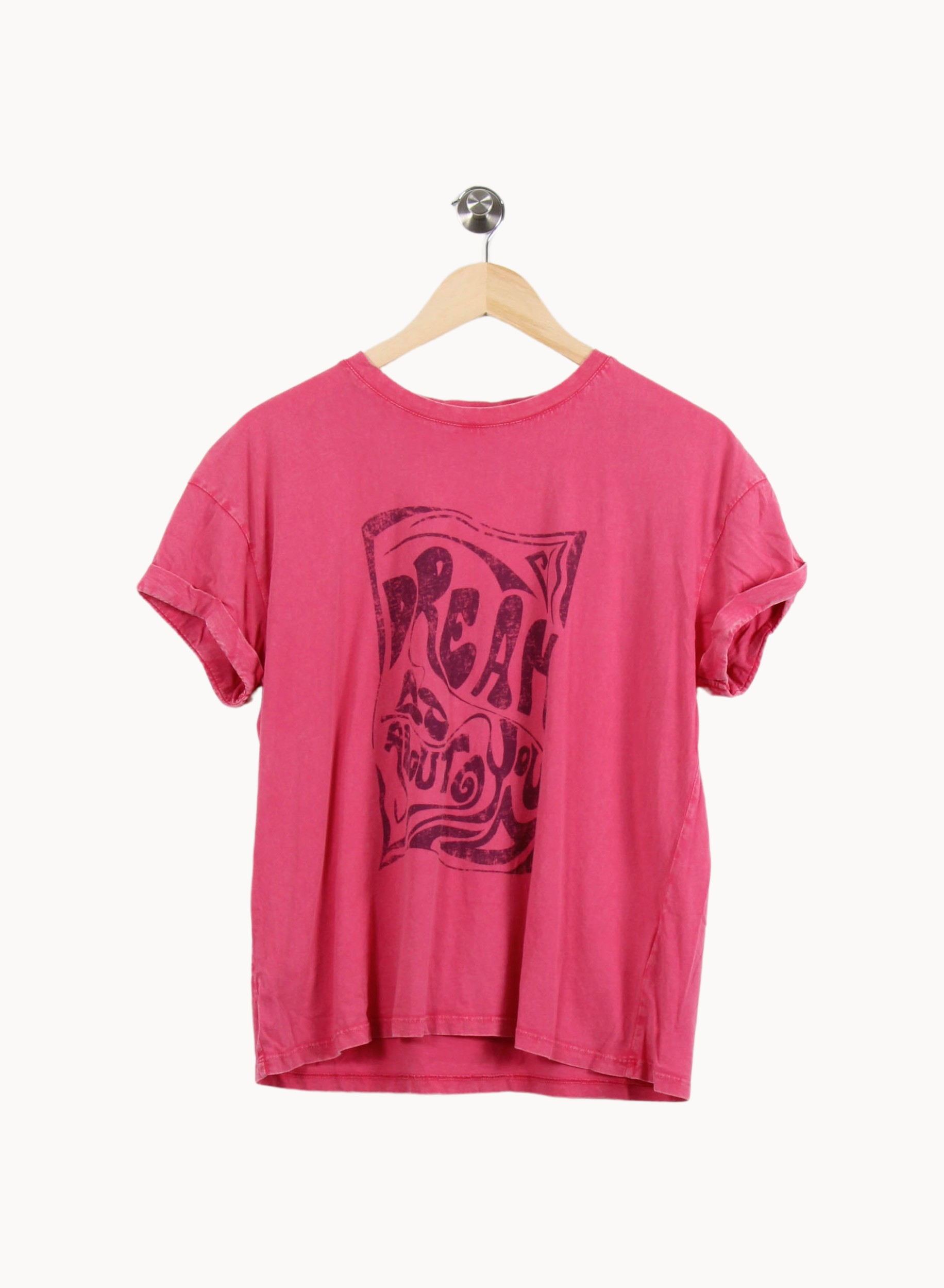 T-shirt IKKS rose à message imprimé "Dream As You" en taille M/38, parfait pour un look décontracté et tendance. Confectionné dans une matière fluide et douce, il se distingue par ses manches roulottées et son inscription graphique, apportant une touche originale et affirmée à la pièce. Idéal pour une sortie entre amis ou une journée détente en ville.