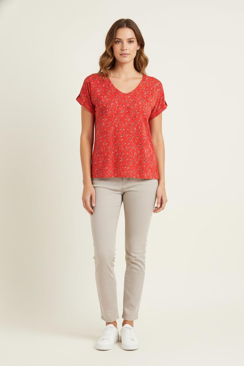 Top rouge Caroll taille M/38, à motif floral, parfait pour une allure féminine et élégante. Confectionné dans une matière fluide, ce haut se distingue par ses manches courtes retroussées et son encolure en V, soulignant la finesse du motif fleuri all-over qui apporte une touche de fraîcheur et d’originalité. Idéal pour une journée estivale ou un déjeuner entre collègues.