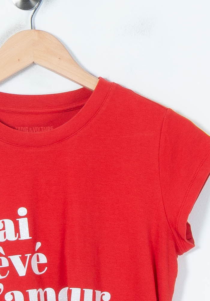 T-shirt rouge "J'ai rêvé d'amour" Zadig&Voltaire, taille S/36, de la marque Zadig&Voltaire. Confectionné en 100% coton, ce t-shirt se distingue par sa matière douce et respirante ainsi que par son imprimé audacieux à message, qui lui confère une touche unique et contemporaine. Idéal pour une sortie décontractée entre amis ou une journée estivale en ville.