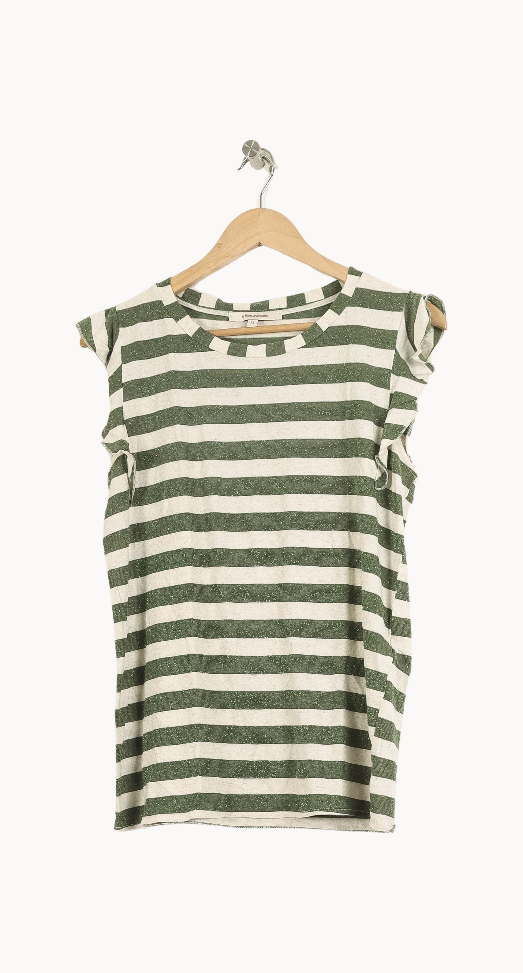 Top femme à rayures vertes et blanches La Fée Maraboutée, taille M/38, au style casual et intemporel. Confectionné dans une matière légère à rayures horizontales, il se distingue par ses manches courtes légèrement volantées qui apportent une touche féminine et délicate. Idéal pour une journée décontractée en ville ou un déjeuner entre amies.