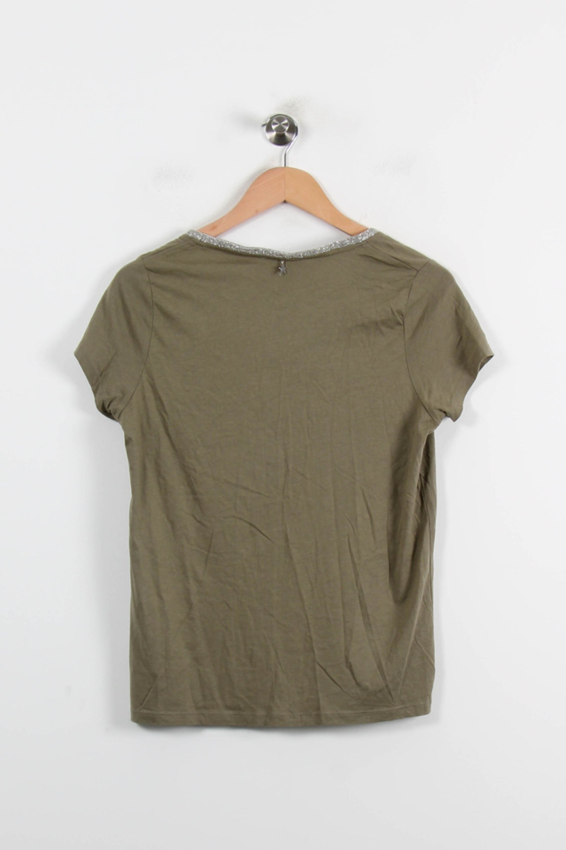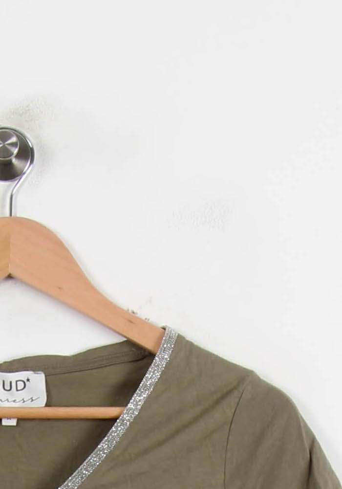 Top vert Sud Express en taille M/38, à manches courtes et col en V agrémenté d’un liseré scintillant pour une touche élégante. Sa matière fluide et légère, associée au détail argenté du col, confère à ce vêtement un aspect moderne et raffiné. Parfait pour une sortie décontractée entre amis ou pour apporter une note chic à une journée de travail.