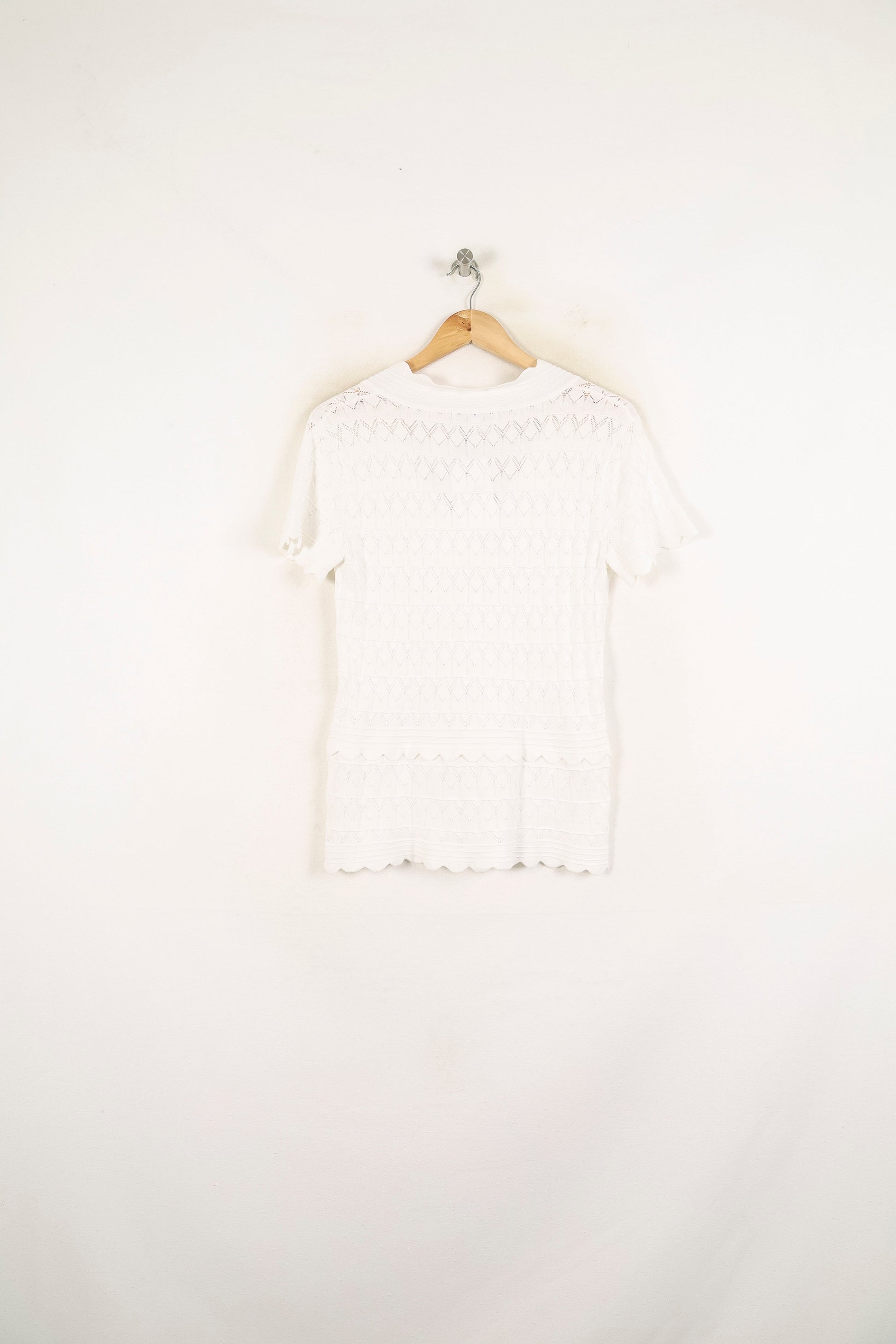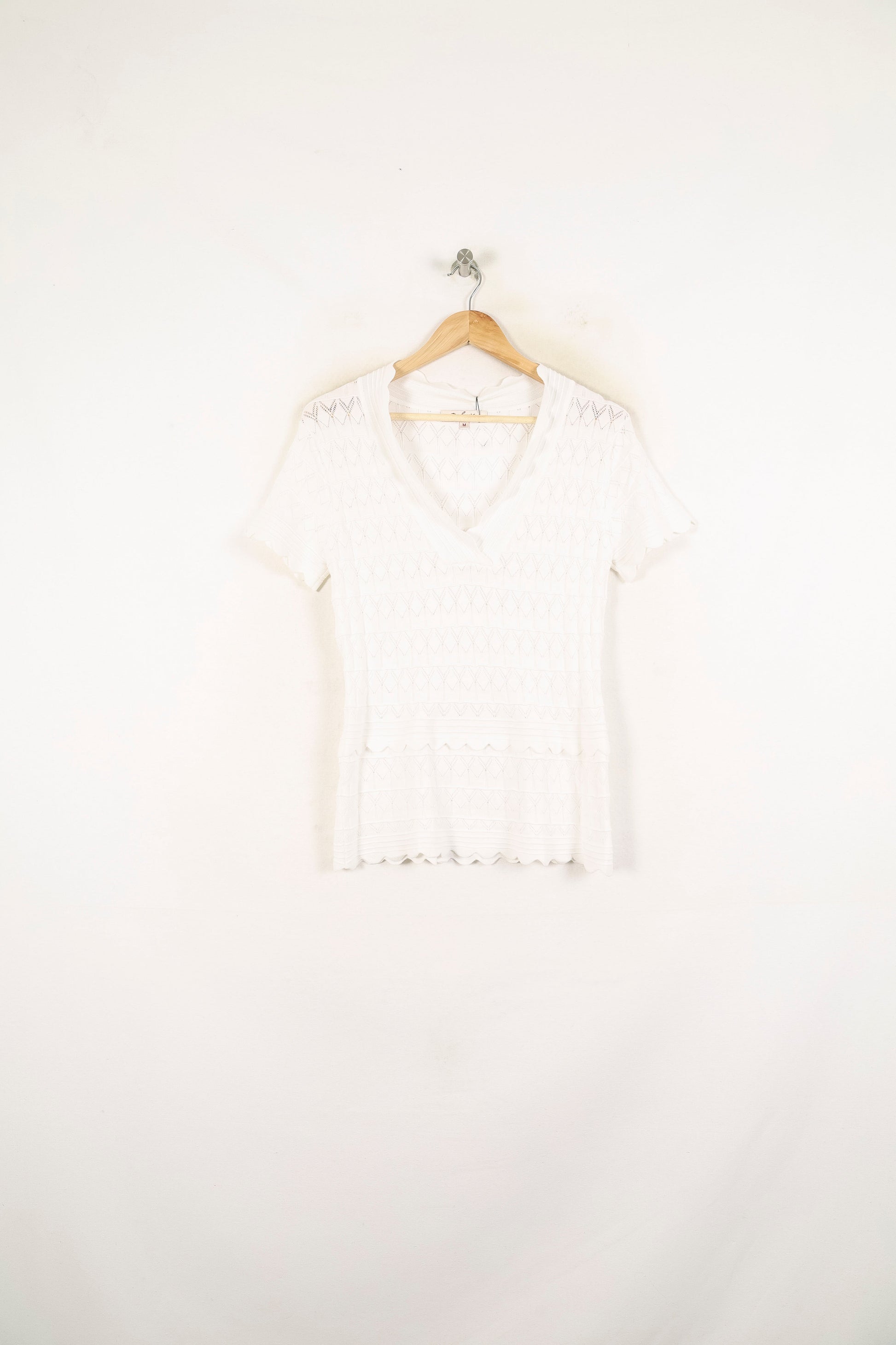 Top blanc Derhy taille M/38, une pièce élégante de la marque reconnue pour son raffinement. Ce haut présente une matière légère et ajourée avec des motifs géométriques subtils, offrant une touche délicate et féminine à l’ensemble. Idéal pour une journée estivale, il se porte parfaitement lors d’un déjeuner entre amis ou pour une sortie en ville.