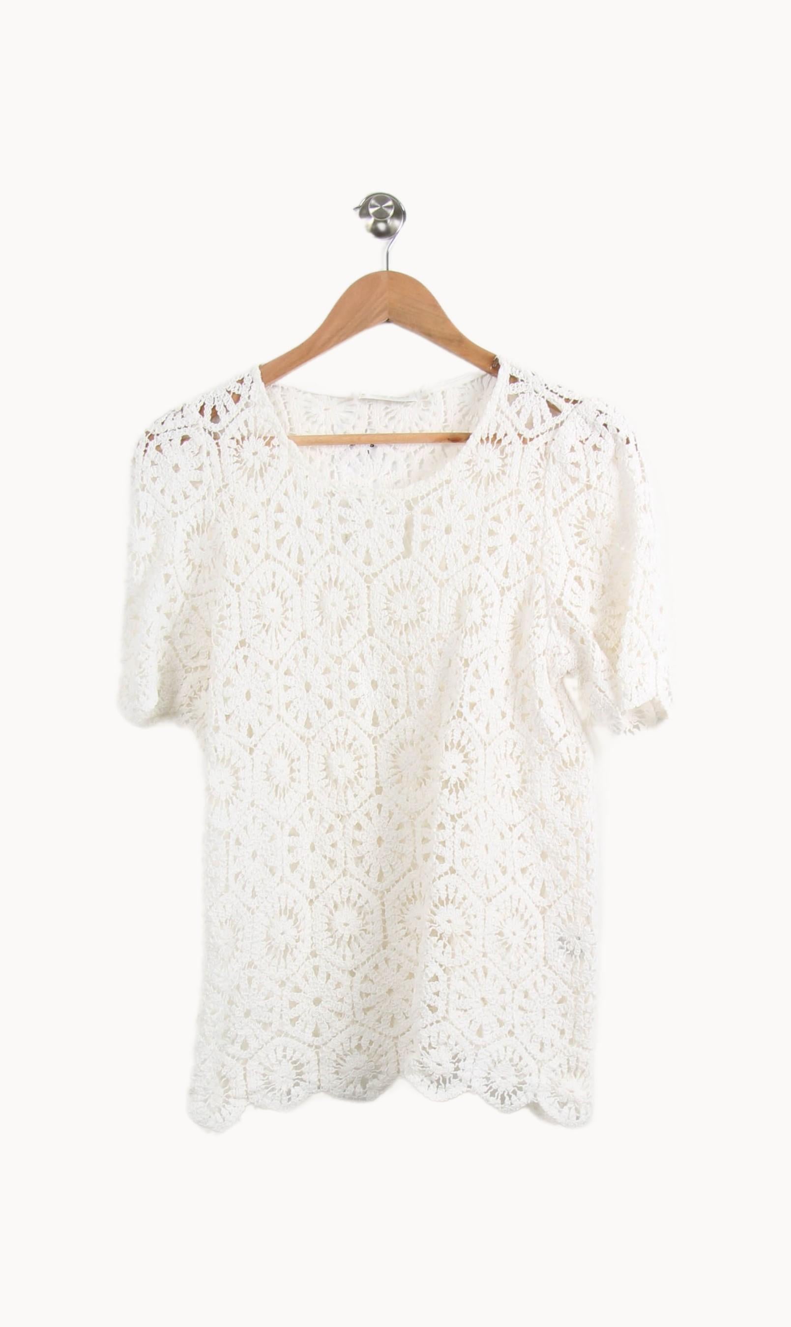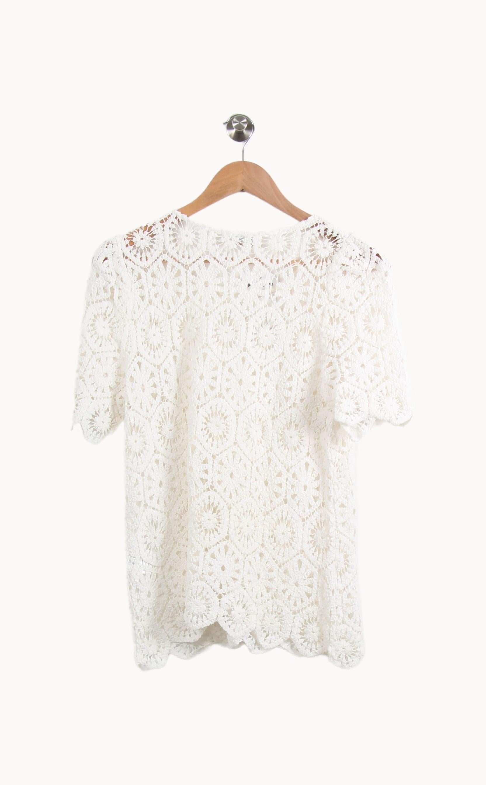 Pull ajouré blanc La Petite Etoile, taille S/36, offrant une allure délicate et féminine. Réalisé en maille crochetée ajourée avec des motifs géométriques floraux, ce modèle se distingue par ses finitions festonnées et son travail raffiné qui lui confèrent une touche unique et élégante. Parfait pour une journée estivale ou un déjeuner en terrasse, apportant charme et sophistication à votre tenue.