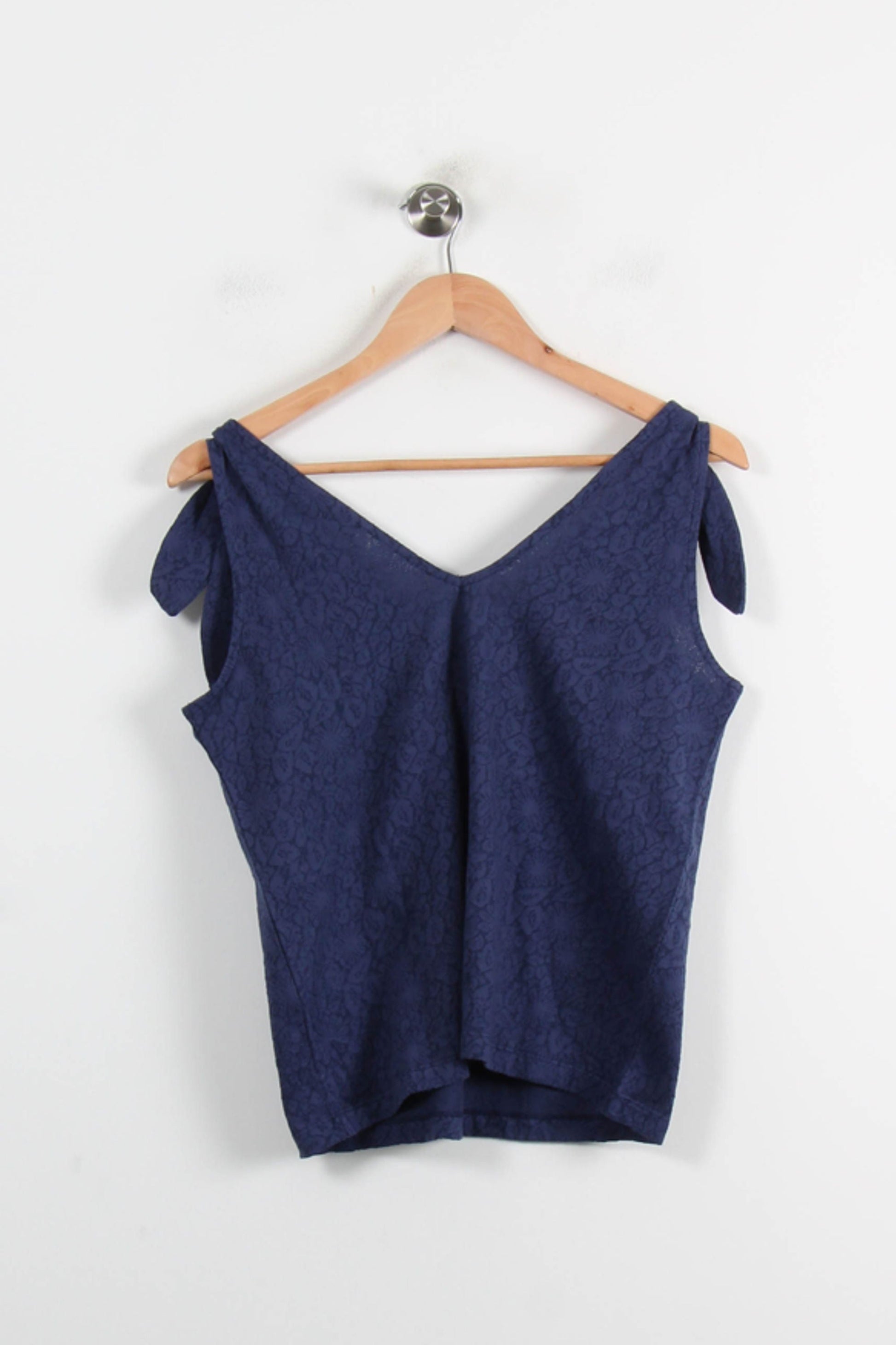 Top bleu La Fée Maraboutée taille M/38, élégant à bretelles nouées sur les épaules. La matière présente un motif floral subtil en ton sur ton qui apporte du raffinement au modèle, tandis que les nœuds sur les épaules offrent une touche originale et féminine. Parfait pour une sortie estivale ou une soirée décontractée entre amis.