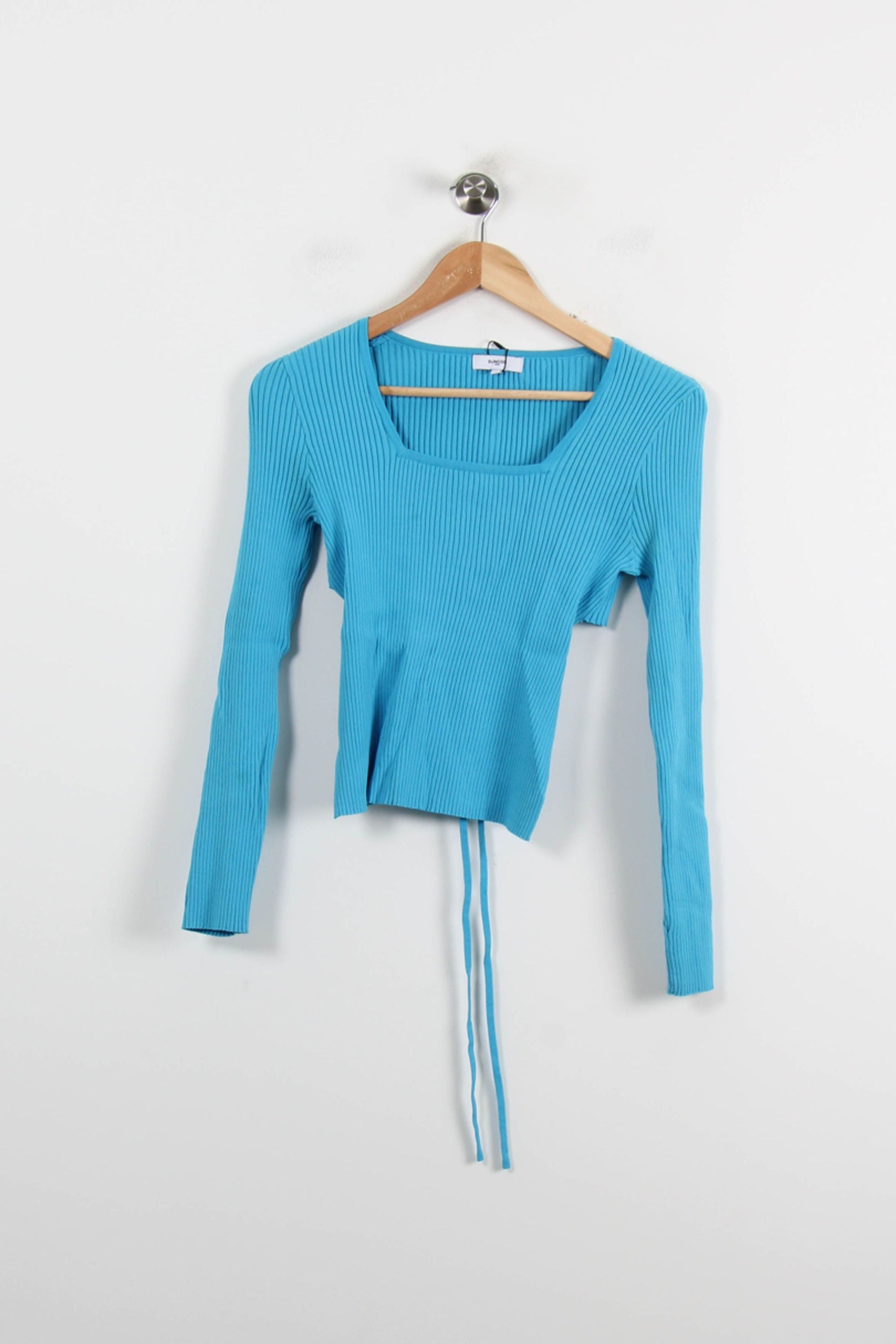 Top à manches longues Suncoo bleu, taille XS/34, à encolure carrée, parfait pour apporter une touche moderne à votre garde-robe. Confectionné dans une maille côtelée extensible, ce modèle se distingue par sa matière texturée et sa découpe originale agrémentée de liens à nouer à l’avant, offrant allure et singularité. Idéal pour un déjeuner entre amis ou une sortie citadine, ce top valorise toutes vos tenues avec élégance.