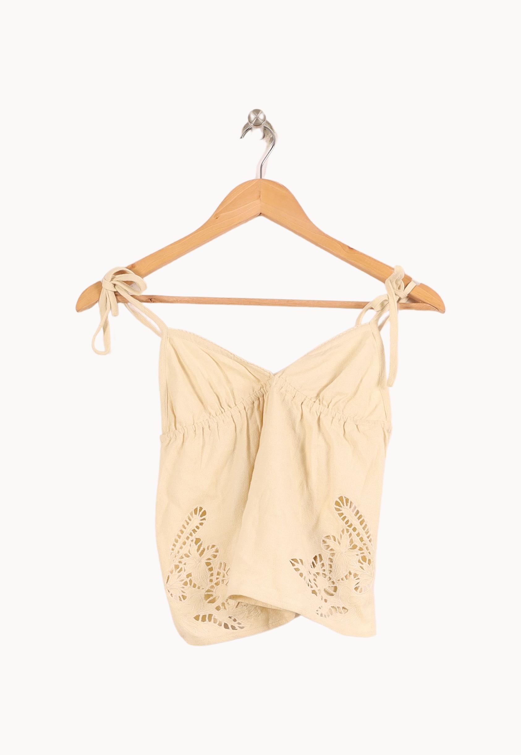 Top jaune Soeur, taille XXS/32 : la partie supérieure des bretelles est fine maintenant avec une coupe distinctive et une délicate couleur jaune crème. La production d'un matériau composé de motifs dans la forme et la base, qui aboutit à un raffinement et une décoration efficaces, donne naissance à une pièce unique grâce à la répartition des détails des découpes. Idéal pour une journée de détente, un look sublime pour une belle promenade sur la terrasse.