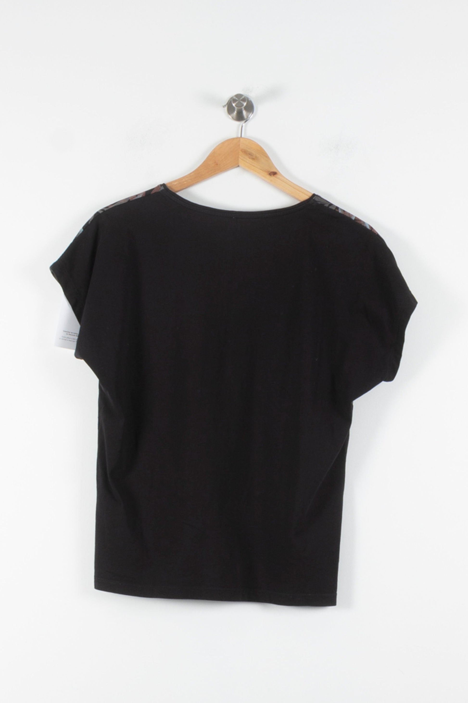 Top noir à motif feuillage I.Code, taille M/38, marque I.Code. Confectionné en 100% coton, ce top présente un empiècement à imprimé végétal coloré sur le haut, apportant une touche graphique unique et élégante au vêtement. Idéal pour une sortie décontractée ou un déjeuner en ville, associé à un jean ou une jupe.