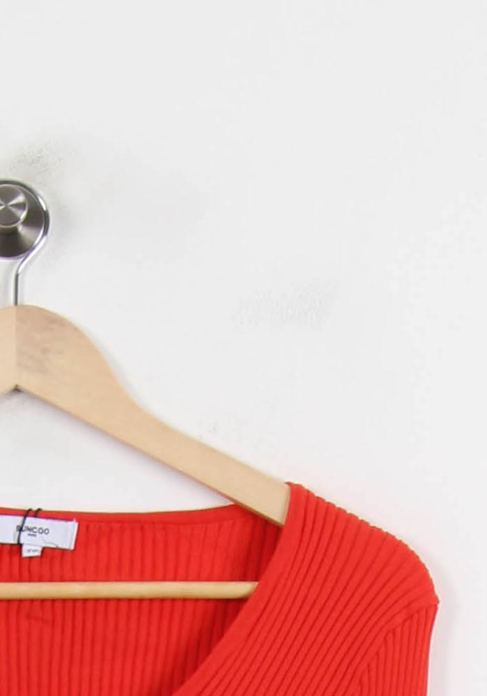 Top manches longues Suncoo orange en taille XS/34, coupe ajustée et col carré. Confectionné dans une maille côtelée apportant élasticité et confort, ce haut se distingue par des liens à nouer sur les côtés, lui conférant une touche originale et contemporaine. Idéal pour un afterwork ou un dîner entre amis, associé à un pantalon taille haute ou une jupe.
