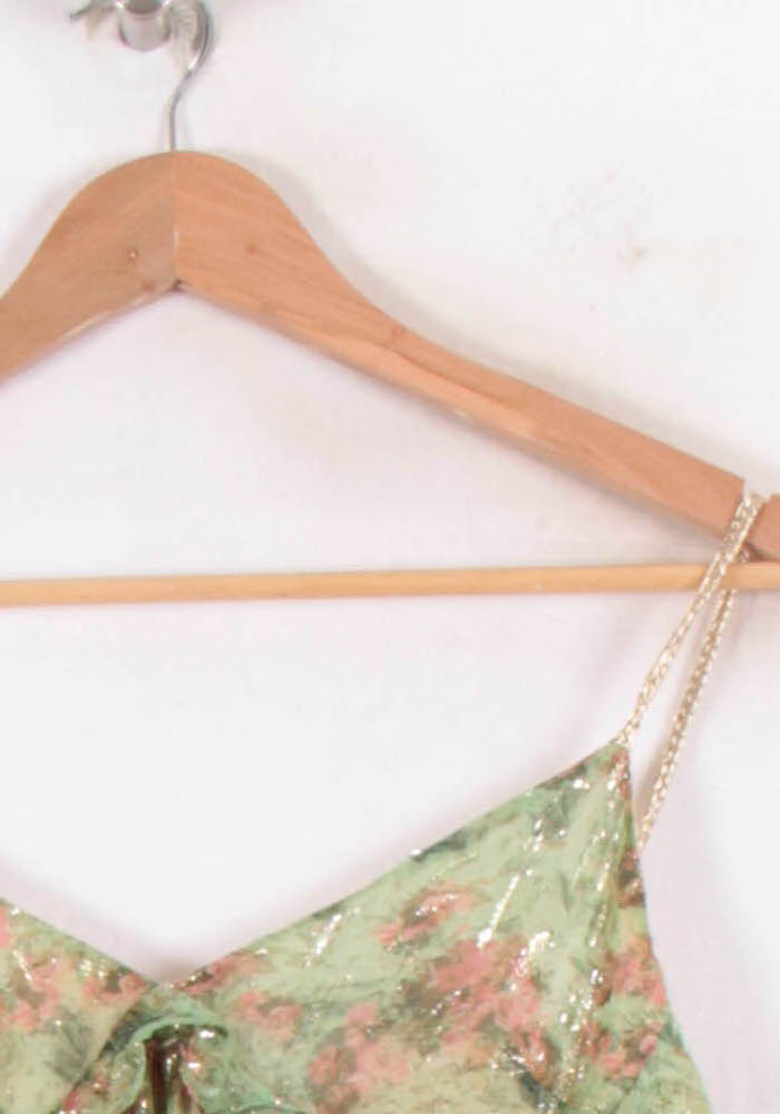 Top à bretelles fines Sézane vert, taille S/36, avec motif floral délicat et subtil jeu de brillance. Confection d'une matière et d'un fluide, le top se distingue par le raffinement de l'imprimé aux effets métalliques et les bretelles ornées, présentant ainsi une allure singulière. Idéal pour une agréable soirée ou un dîner élégant en terrasse.