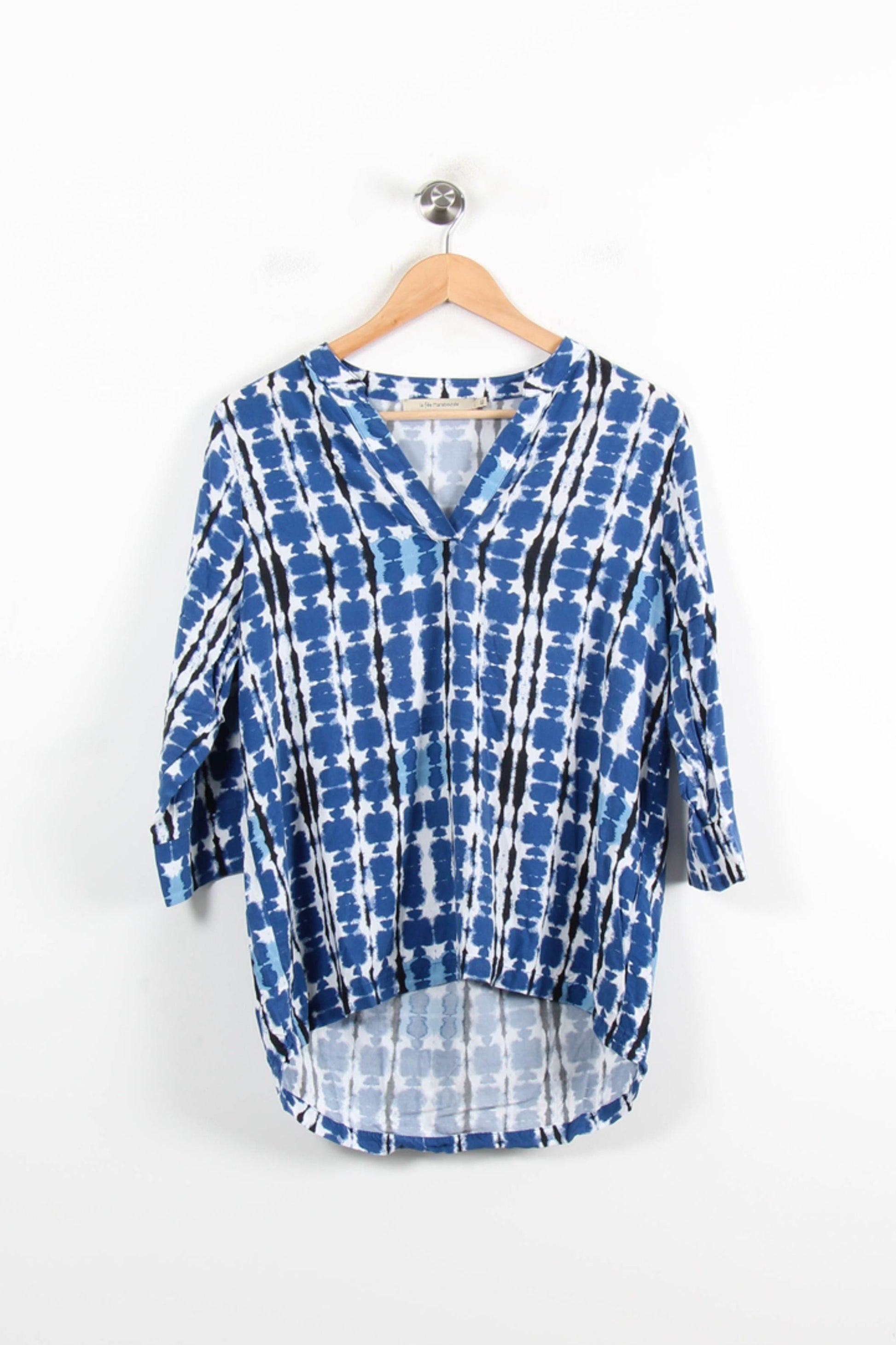 Top bleu à motif tie & dye La Fée Maraboutée, taille L/40, parfait pour une allure élégante et décontractée. Confectionné dans une matière légère, ce top se distingue par ses manches 3/4, son col en V subtil et son imprimé graphique bleu et blanc qui apporte une touche artistique et moderne. Idéal pour une journée estivale en ville ou un dîner convivial entre amis.