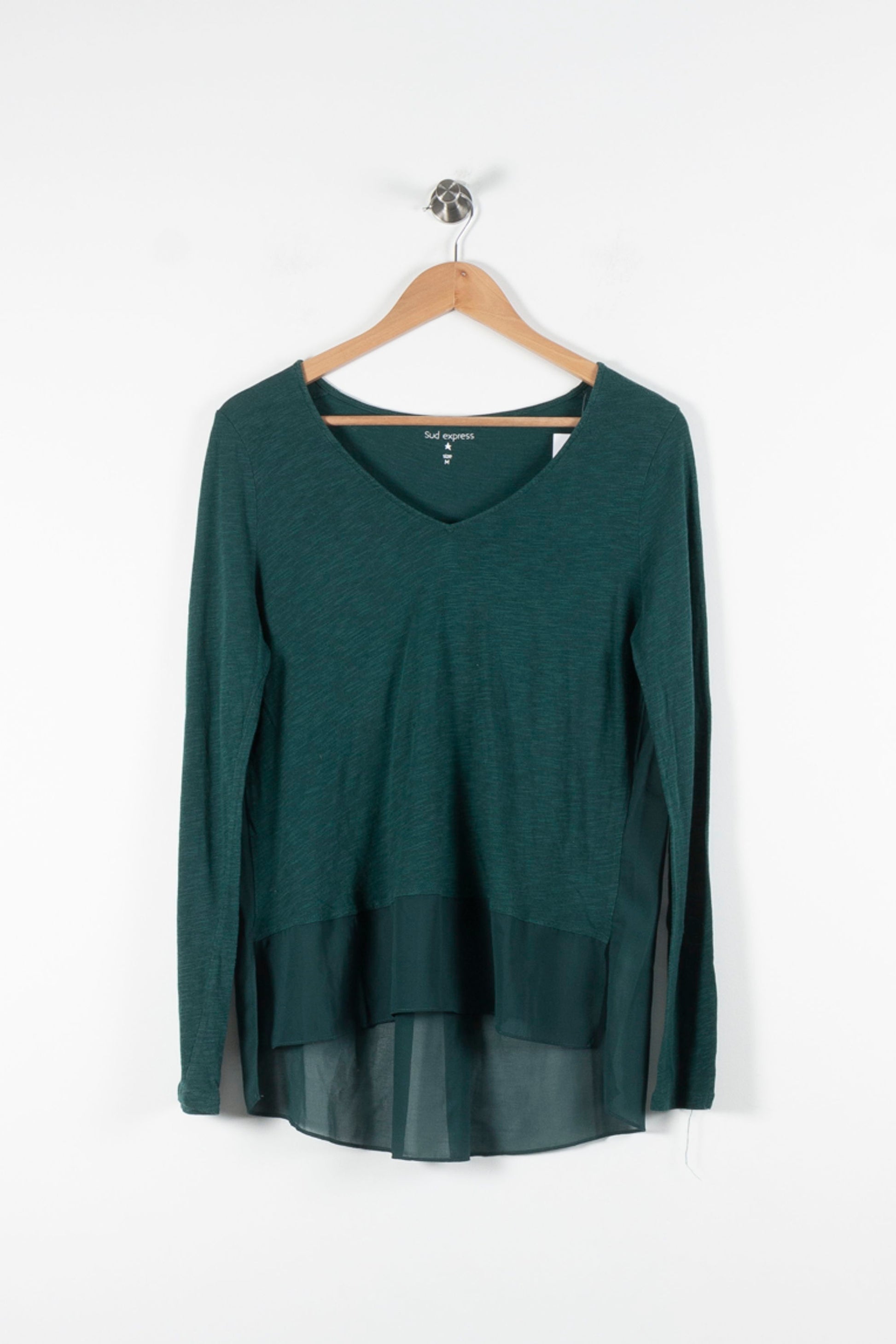Top vert Sud Express taille M/38, à manches longues et col en V, idéal pour une tenue élégante et décontractée. Sa matière fluide, accompagnée d’un jeu de transparence en bas et d’un double effet de superposition, lui confère une allure féminine et originale. Parfait pour une journée au bureau ou un dîner entre amis.