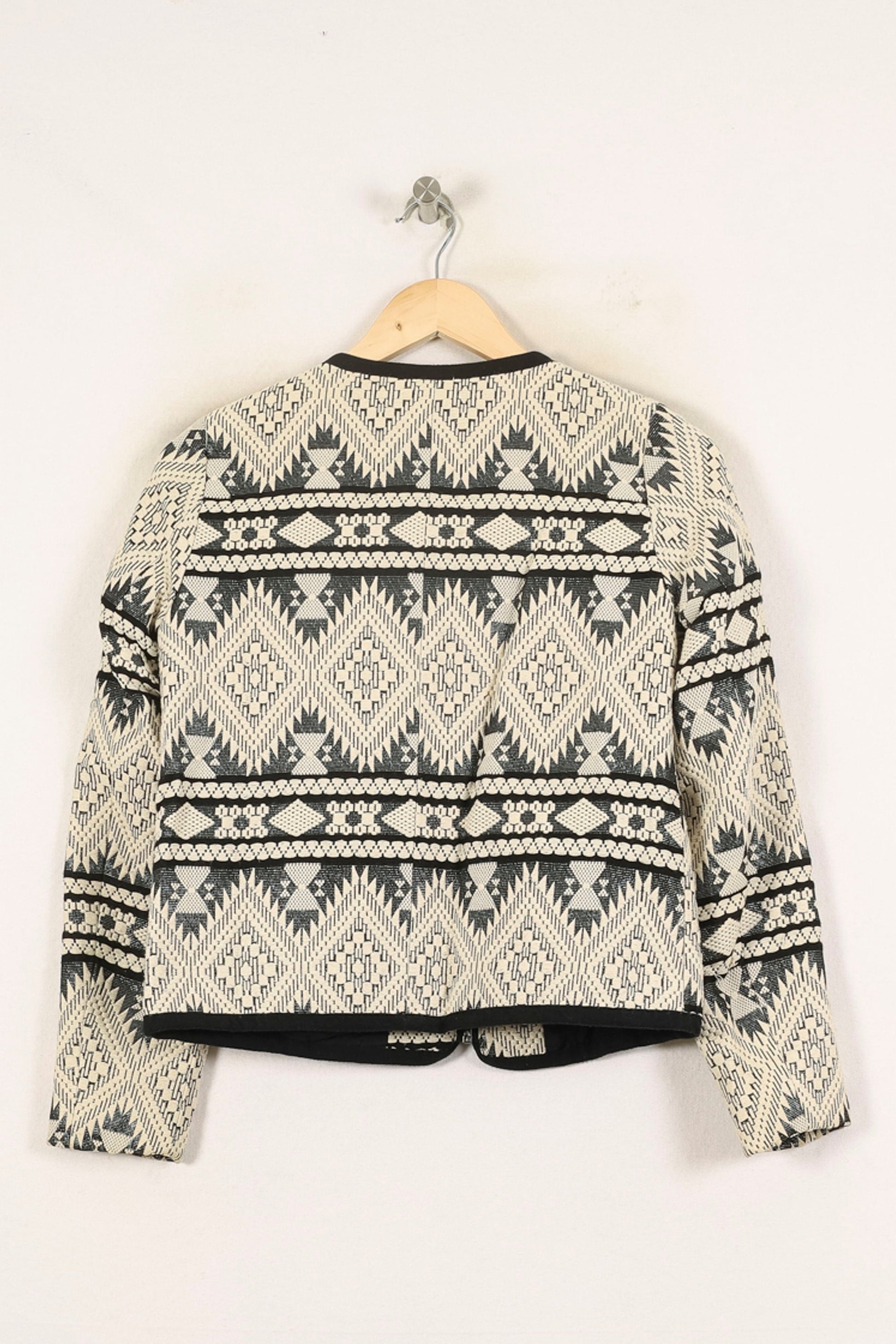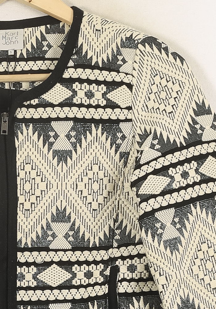Veste femme Karl Marc John, taille S/36, coloris beige, avec motifs géométriques noirs et fermeture zippée sur le devant. La confiserie est confectionnée à partir d'une texture de matière adaptée à l'aspect de la peinture, ce qui fait la différence entre les motifs, les motifs ethniques et les bords noirs contrastants, apportant une touche appropriée de caractère et d'originalité. Rénover un bureau élégant et organiser une soirée pendant la durée du contrat.