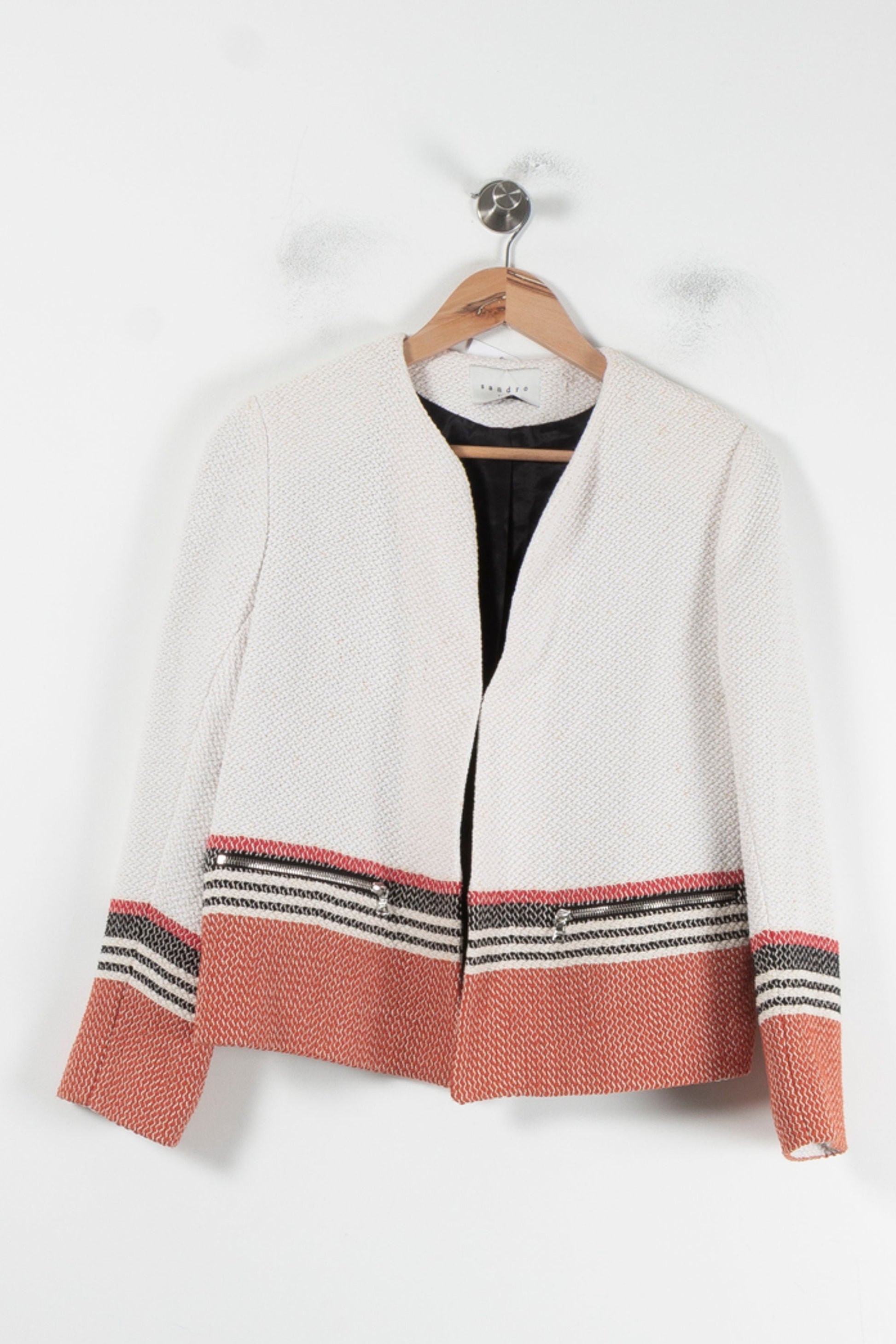 Veste Sandro femme, taille L/40, couleur beige, ornée de liserés contrastés orange et noirs pour un style raffiné et moderne. Confiserie à la texture mélangée composée de 82 % de coton et 18 % d'acrylique, doublée et 100 % de viscose, qui constitue la partie principale de la structure sans le col et les bords zippés. Idéal pour relooker votre bureau ou sublimer votre tenue pour un dîner en ville.