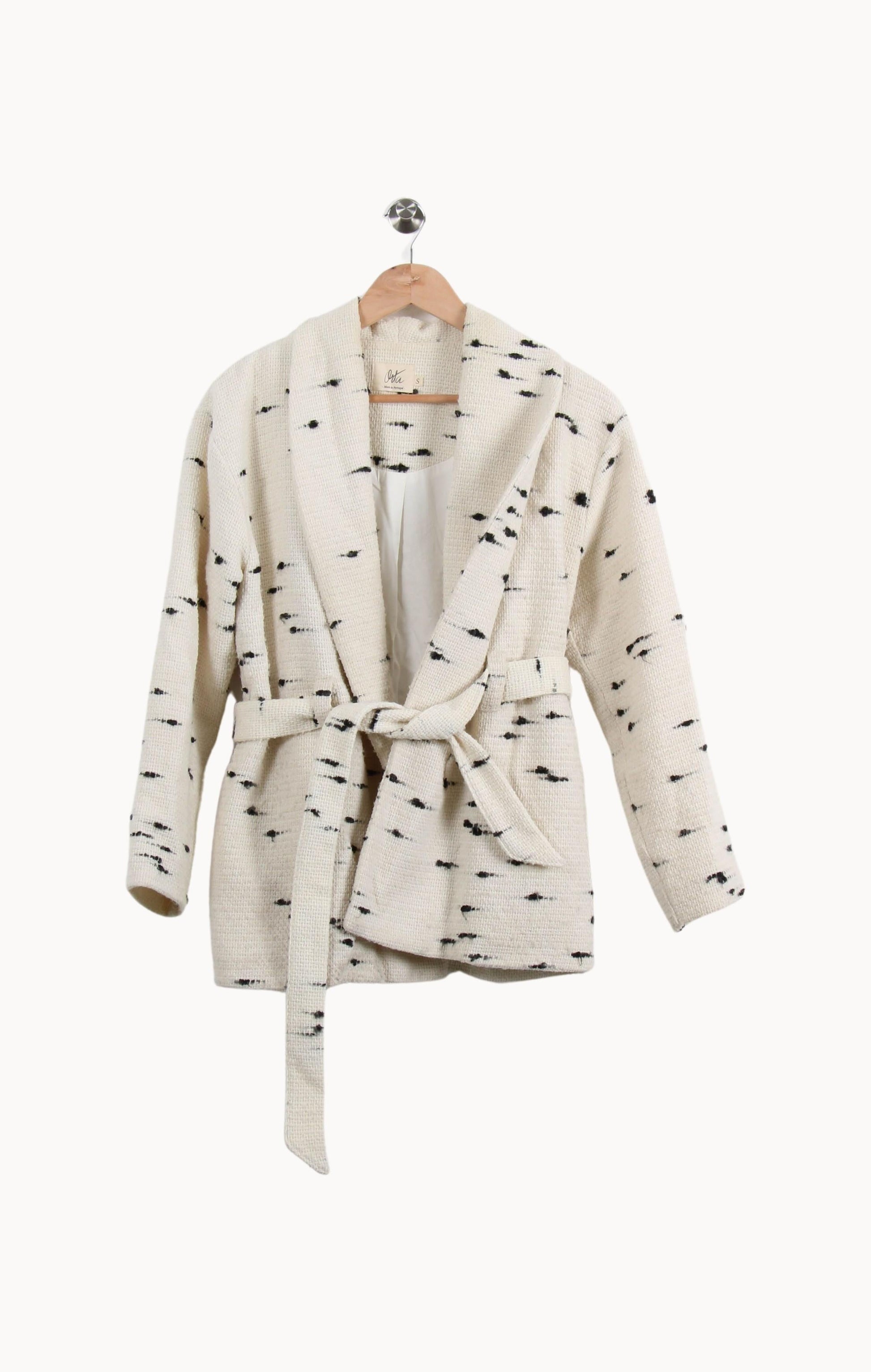 Manteau Orta blanc à imprimé subtil noir, taille S/36 – une pièce au design raffiné pour les amateurs de manteaux élégants. La construction d'une texture matérielle en fonction de son aspect, la distinction entre les motifs noirs et l'apparence de l'intérieur, avec modernité et originalité dans le dressing. Idéal pour porter une citadine ou un rendez-vous approprié pour une allure contemporaine.
