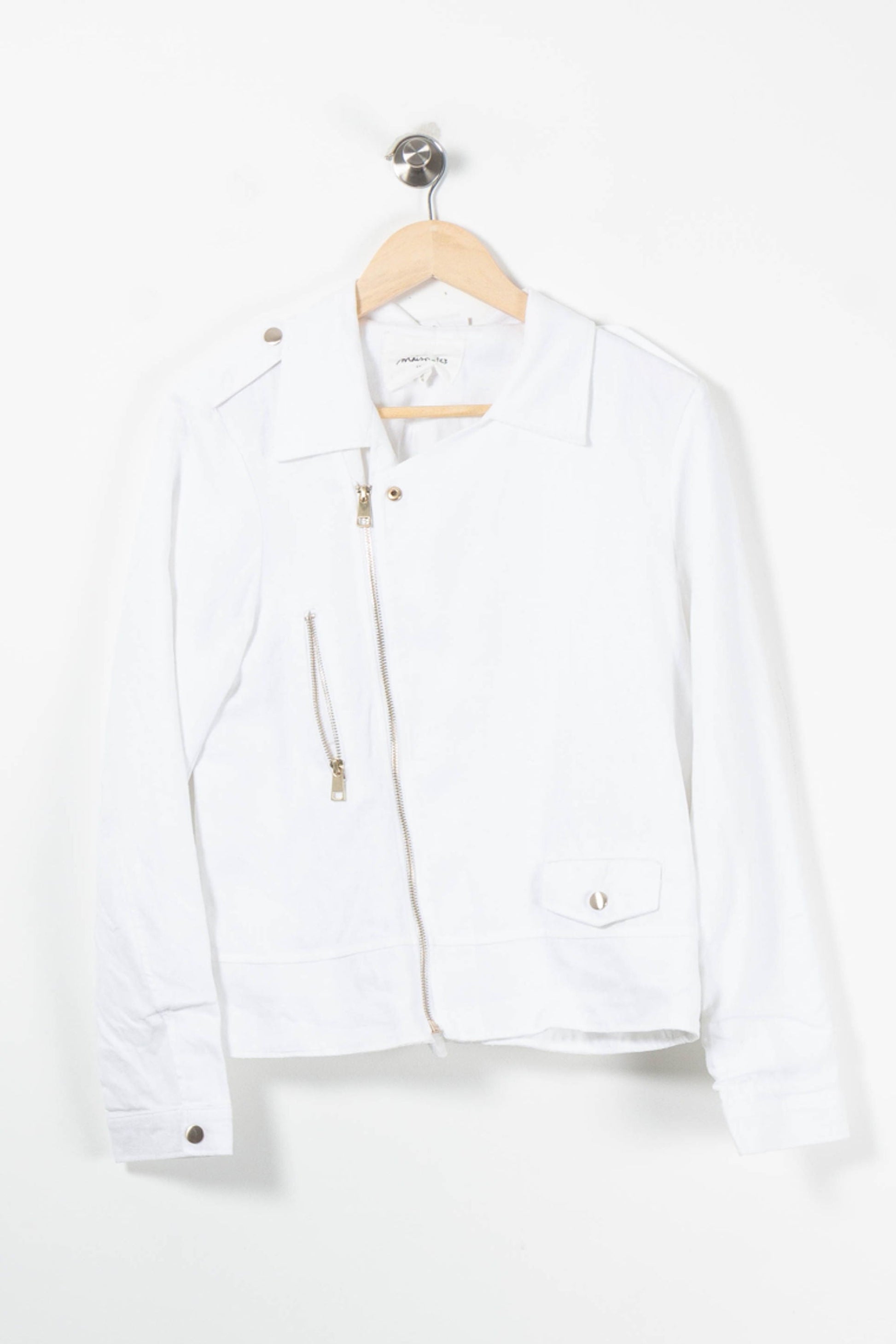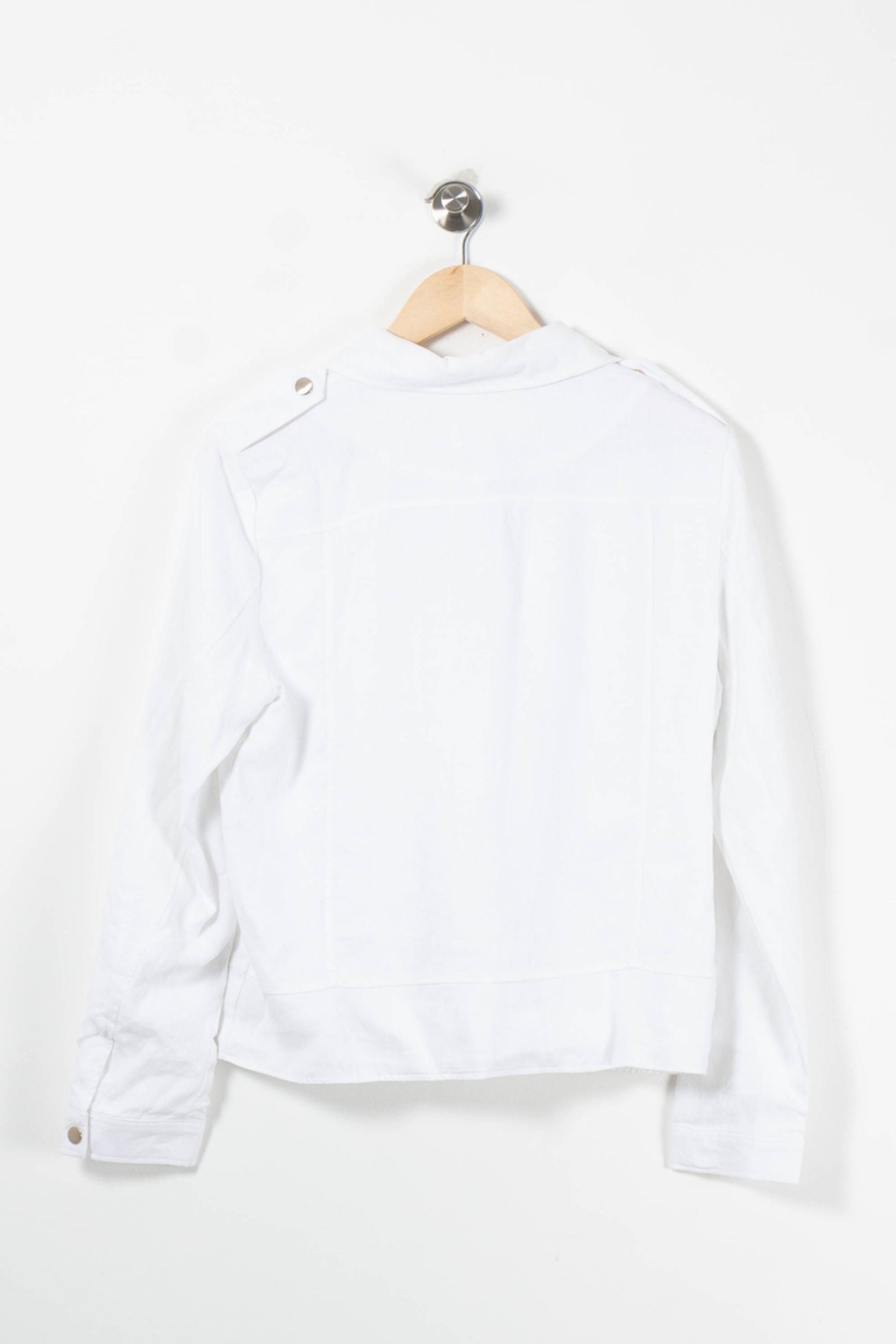 Veste blanche en lin Maison 123, taille M/38, coupe courte et fermeture zippée asymétrique. Confectionné en lin 100%, ce vêtement bénéficie de finitions soignées, d'une respirabilité optimale, de détails raffinés en métal et de finitions qui lui confèrent une allure moderne et élégante. Idéal pour une agréable soirée ou un rendez-vous, et pour apporter une touche sophistiquée à votre tenue.