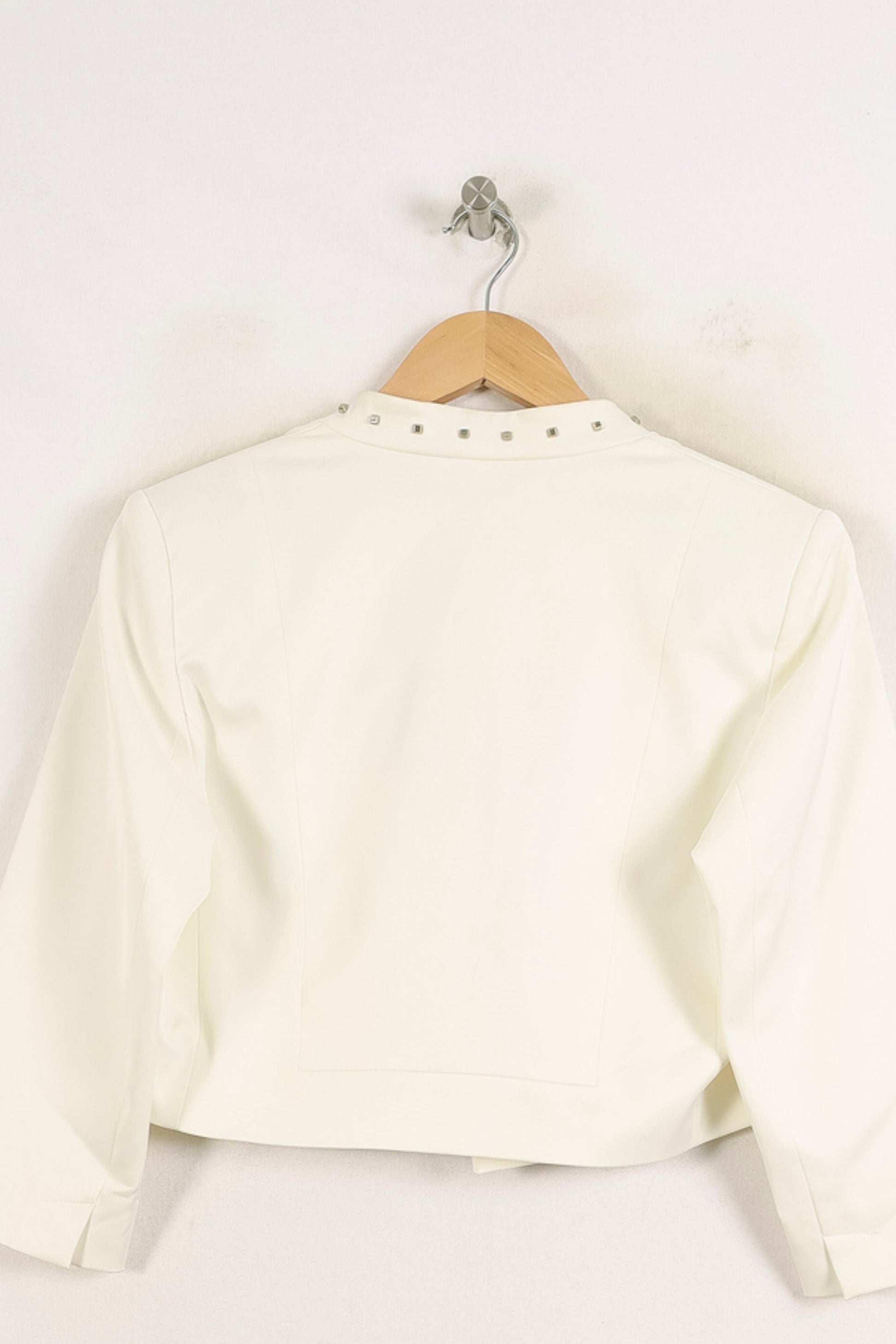 Veste courte blanche ZAPA élégante, taille XXL/44, idéale pour une allure moderne et raffinée. Le design et la structure reprennent la forme de la géométrie, ce qui en fait une pièce à la fois contemporaine et unique. Parfait pour une tenue professionnelle, une réception ou une soirée chic.