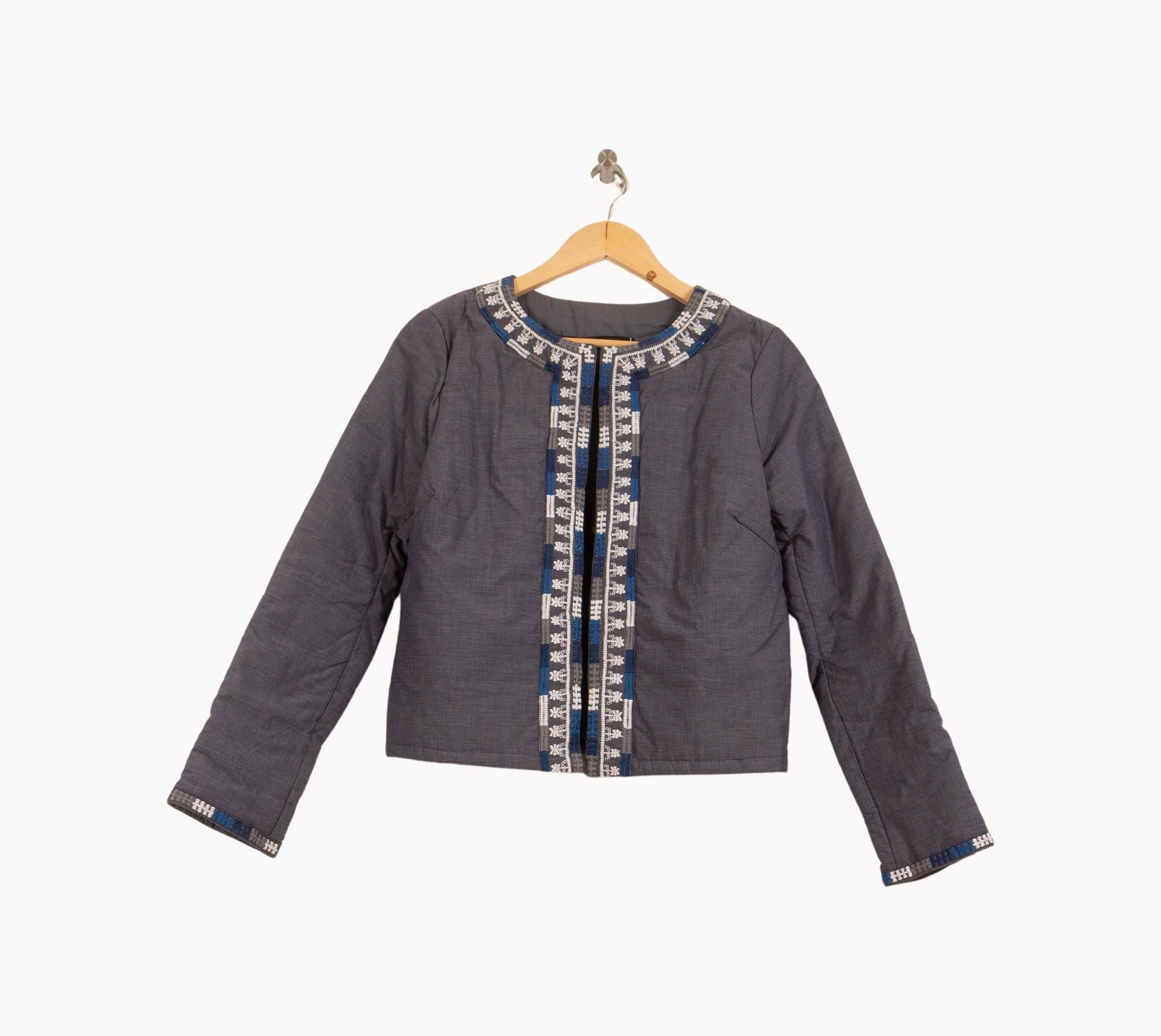 Veste courte Bérénice en bleu, taille S/36, présentée avec une coupe à col rond, élégante. La finition du matériau utilisé est sublime dans le contraste entre la broderie et la longue coloration, la fermentation centrale et la finition, l'originalité et le raffinement du modèle. Idéal pour une tenue sublime au bureau ou pour une soirée chic.