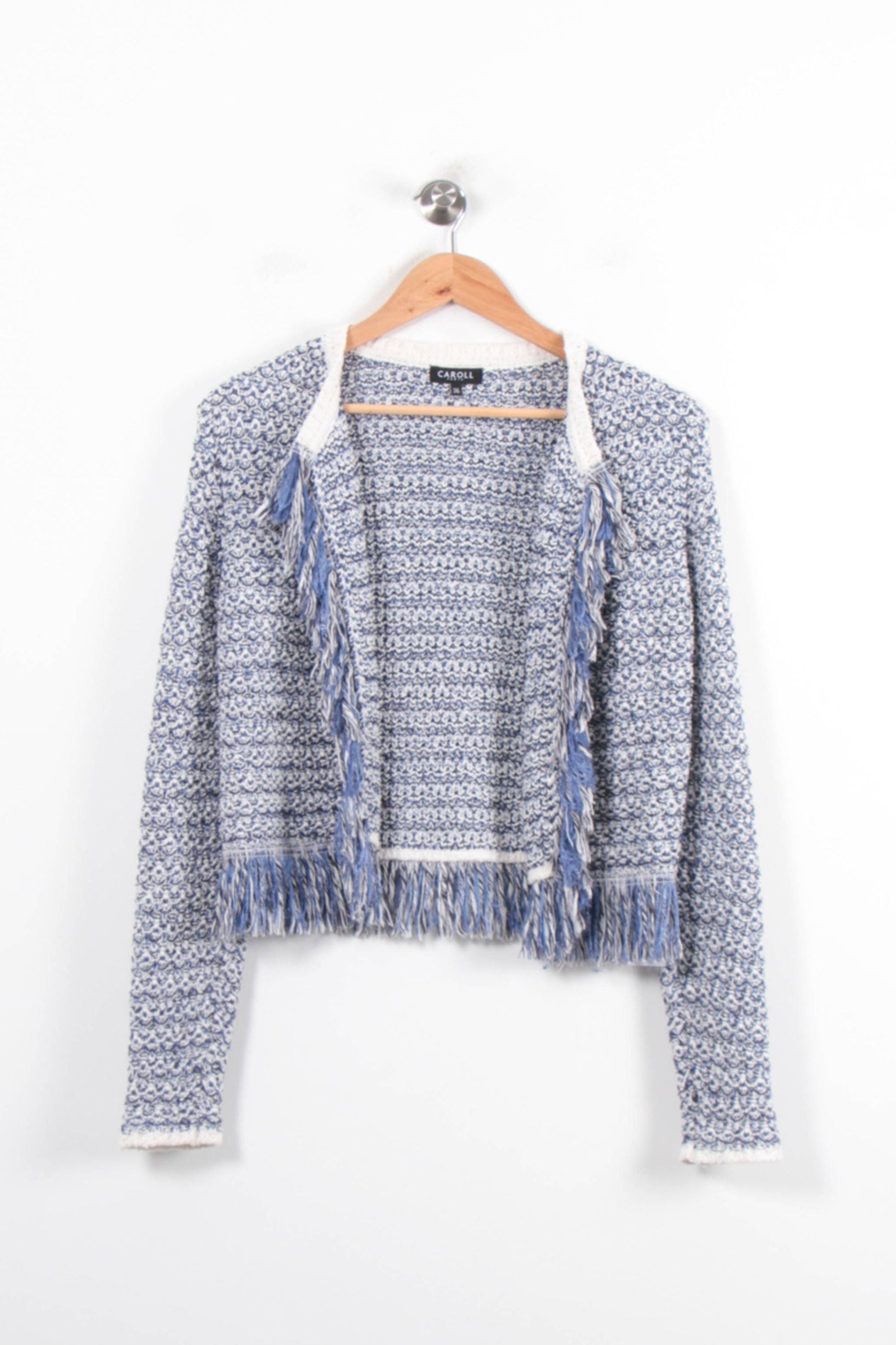 Cardigan Caroll bleu taille S/36, à la coupe droite et manches longues, avec motif dans un mélange bleu et blanc. Avec la texture brute des pointes, ou les contrastes français sur les bords pour une touche d'originalité et de sophistication. Idéal pour une journée de voyage ou pour une tenue de week-end sublime et élégante.