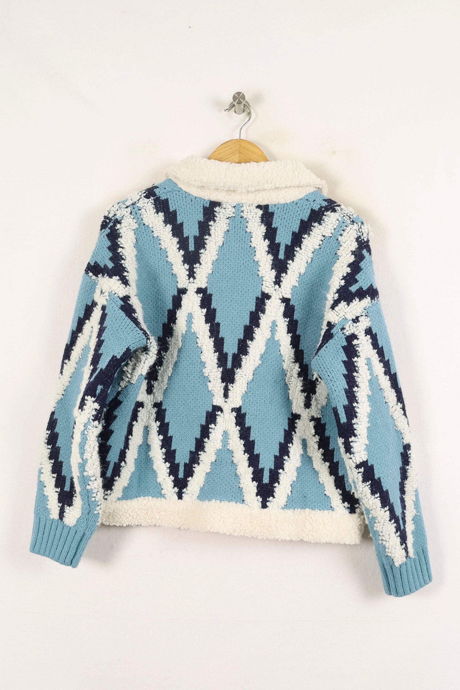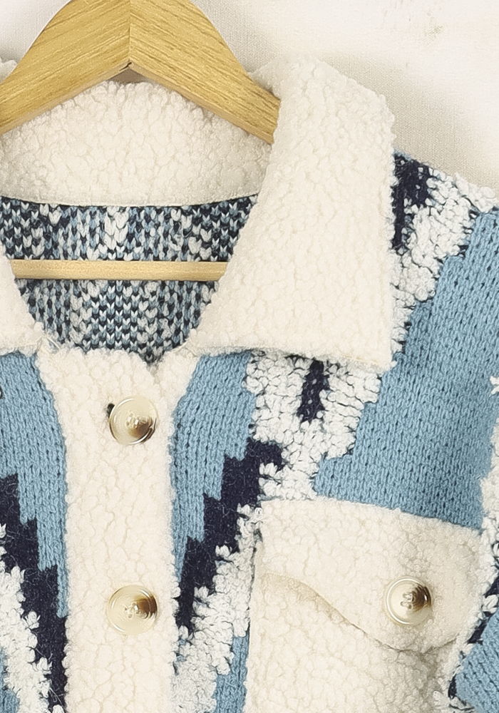Veste Bérénice bleue à motifs géométriques, taille S/36, fabriquée par la marque Bérénice. Confection et maille épaisse avec finitions effet sherpa, motifs contrastés bleu et écru, grand col et fausse fourrure et plaquées sur la poitrine, pour un style à la fois cosy et tendance. Idéal à porter d'une promenade hivernale en ville ou pour réchauffer une tenue casual chic lors d'un brunch entre amis.