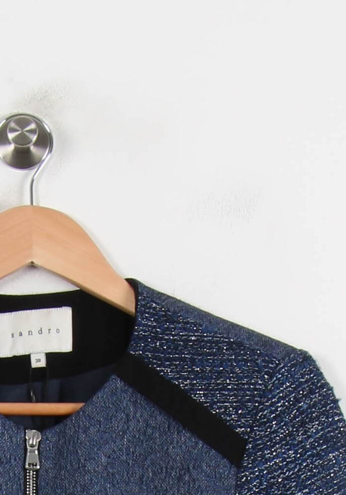 Veste Sandro bleu, taille M/38, coupe à la moderne et épurée, idéale pour sublimer une silhouette féminine. Le mélange de textures raffinées est associé au liseré bleu sur les manches pour parfaire la subtilité de la texture sur l'ensemble du corps, et les détails noirs ajoutent une touche graphique élégante. Ce modèle s'adapte aussi bien à une occasion professionnelle qu'à un dîner élégant, pour une allure chic et contemporaine.