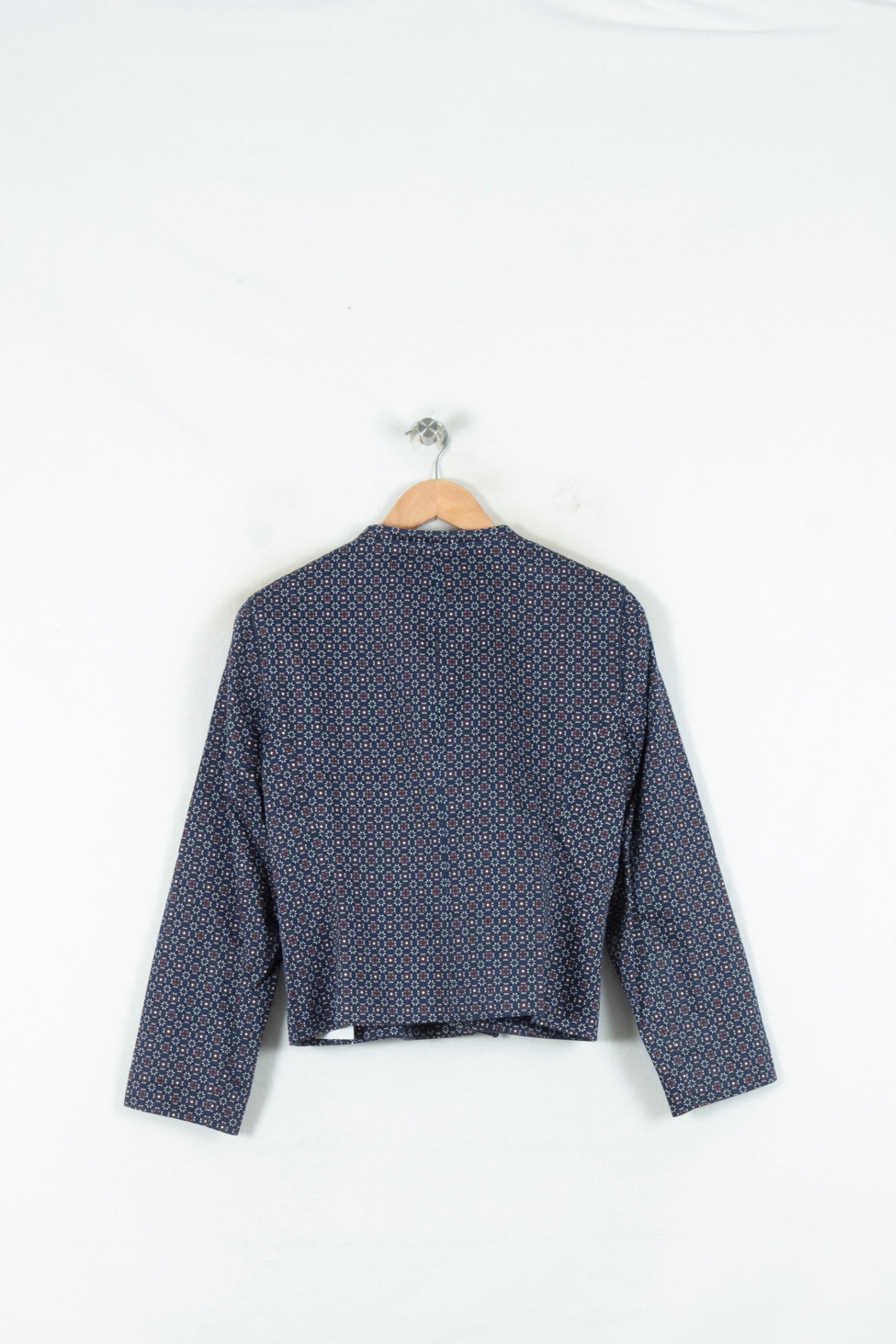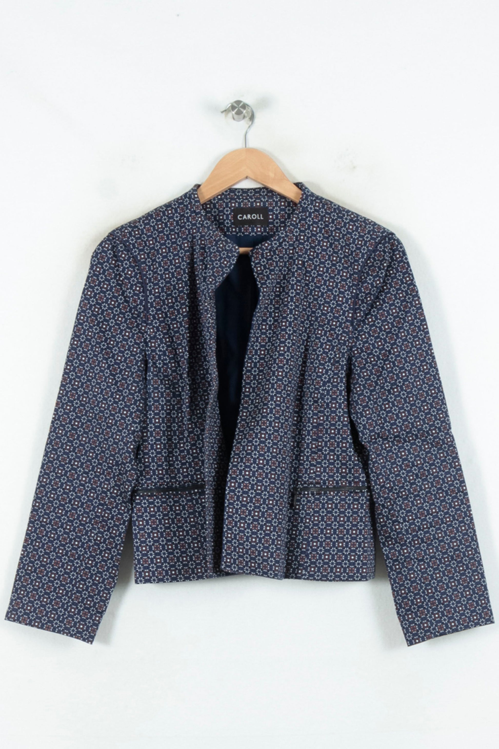 Veste Caroll bleu à motifs géométriques, taille XL/42, associant élégance et modernité à travers sa coupe droite et structurée. Son tissu à imprimé graphique, rehaussé par une finition soignée et de délicats liserés sur les poches, confère à la veste un style raffiné et distinctif. Idéale pour sublimer une tenue de bureau ou pour une occasion professionnelle nécessitant une touche sophistiquée.